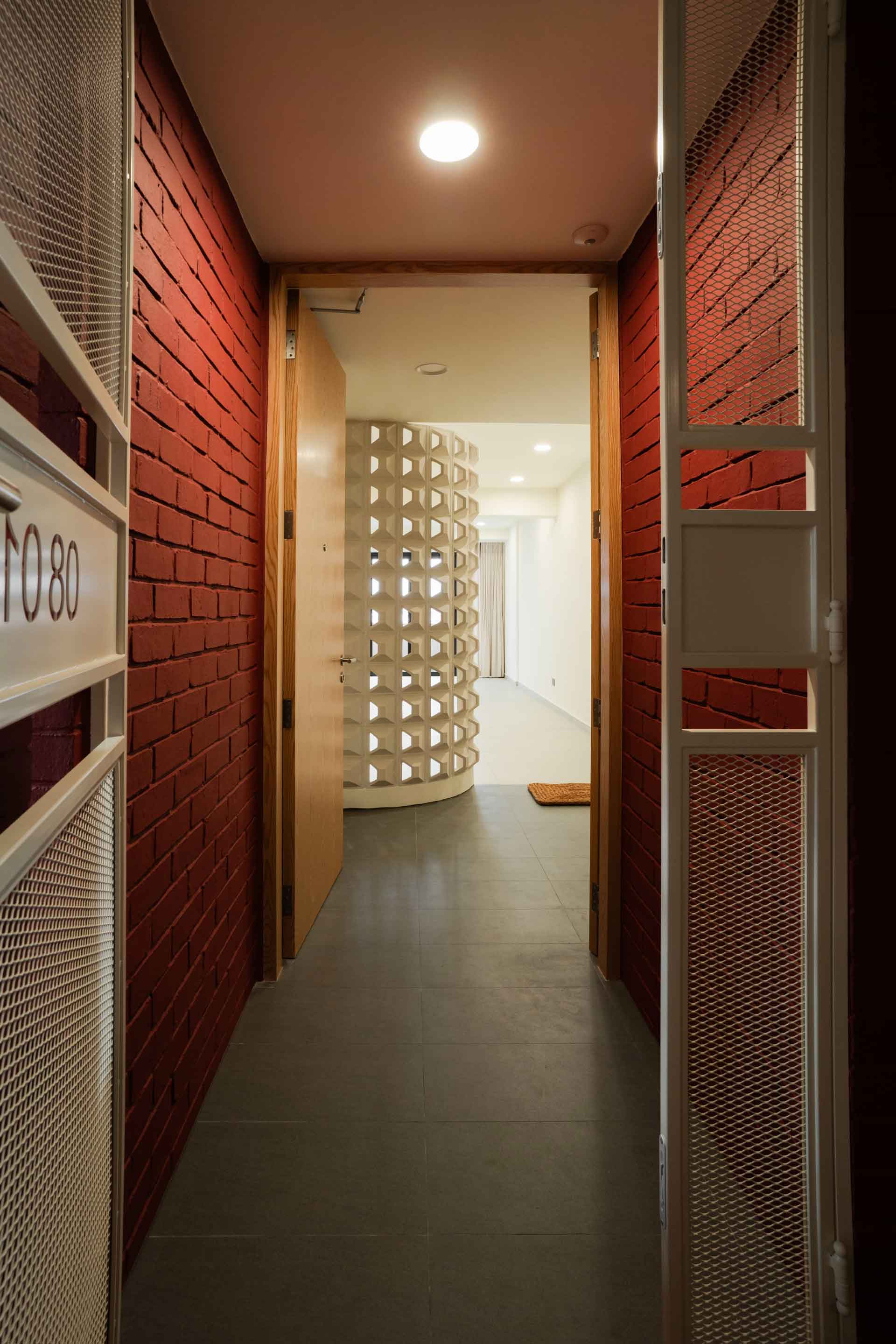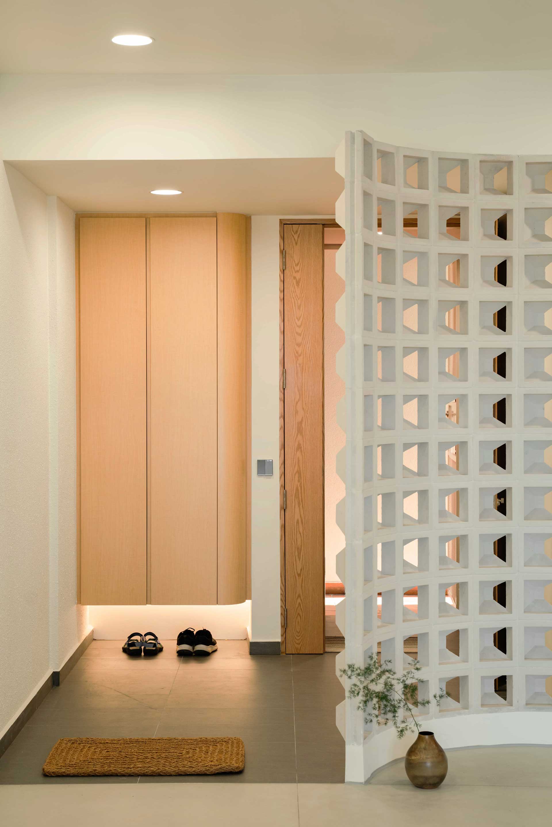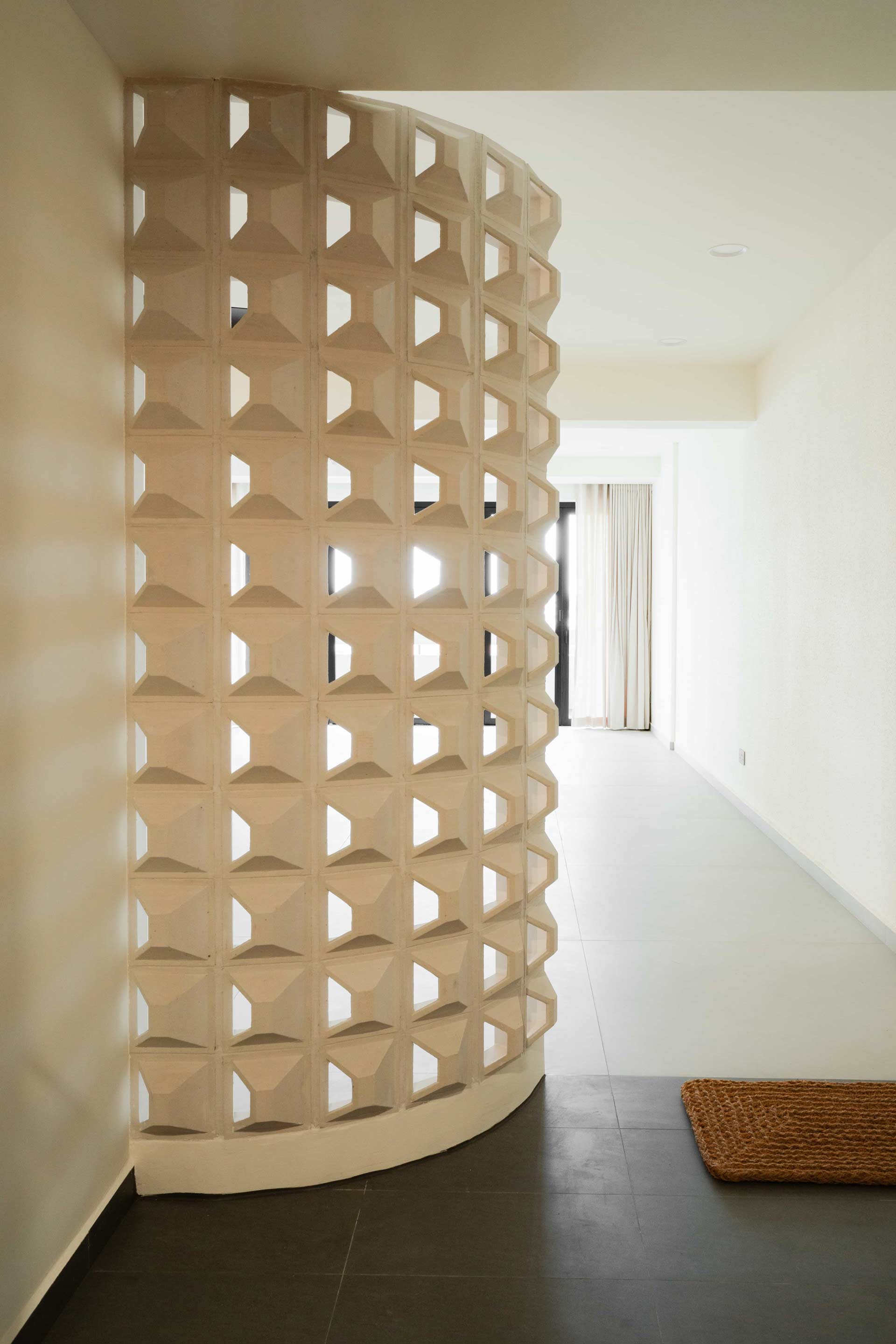Natural materials take center stage in the design narrative, with large format tiles selected to emulate the rugged elegance of concrete flooring, enhancing the sense of spaciousness in the living areas. At the foyer, a curved full-height wall constructed with ventilation blocks ensures privacy while promoting airflow—a seamless integration of form and function.