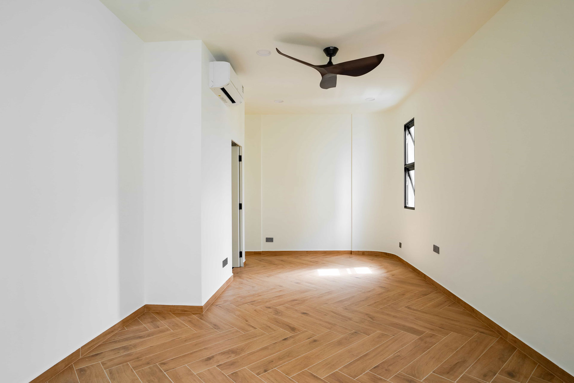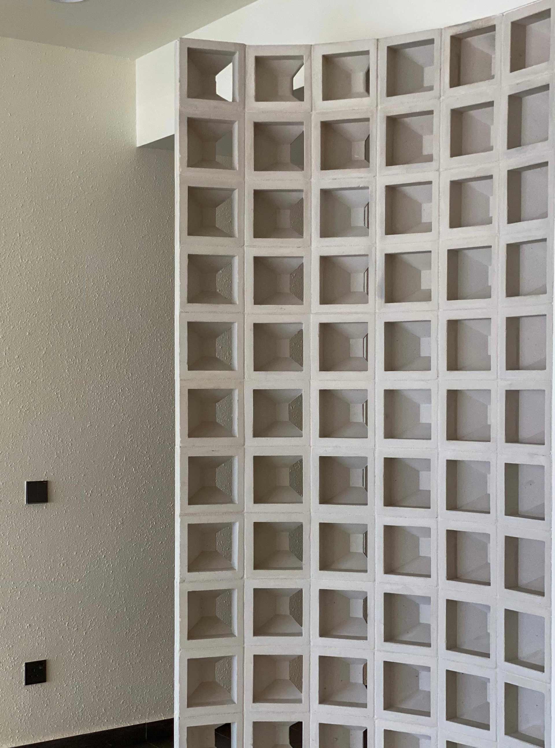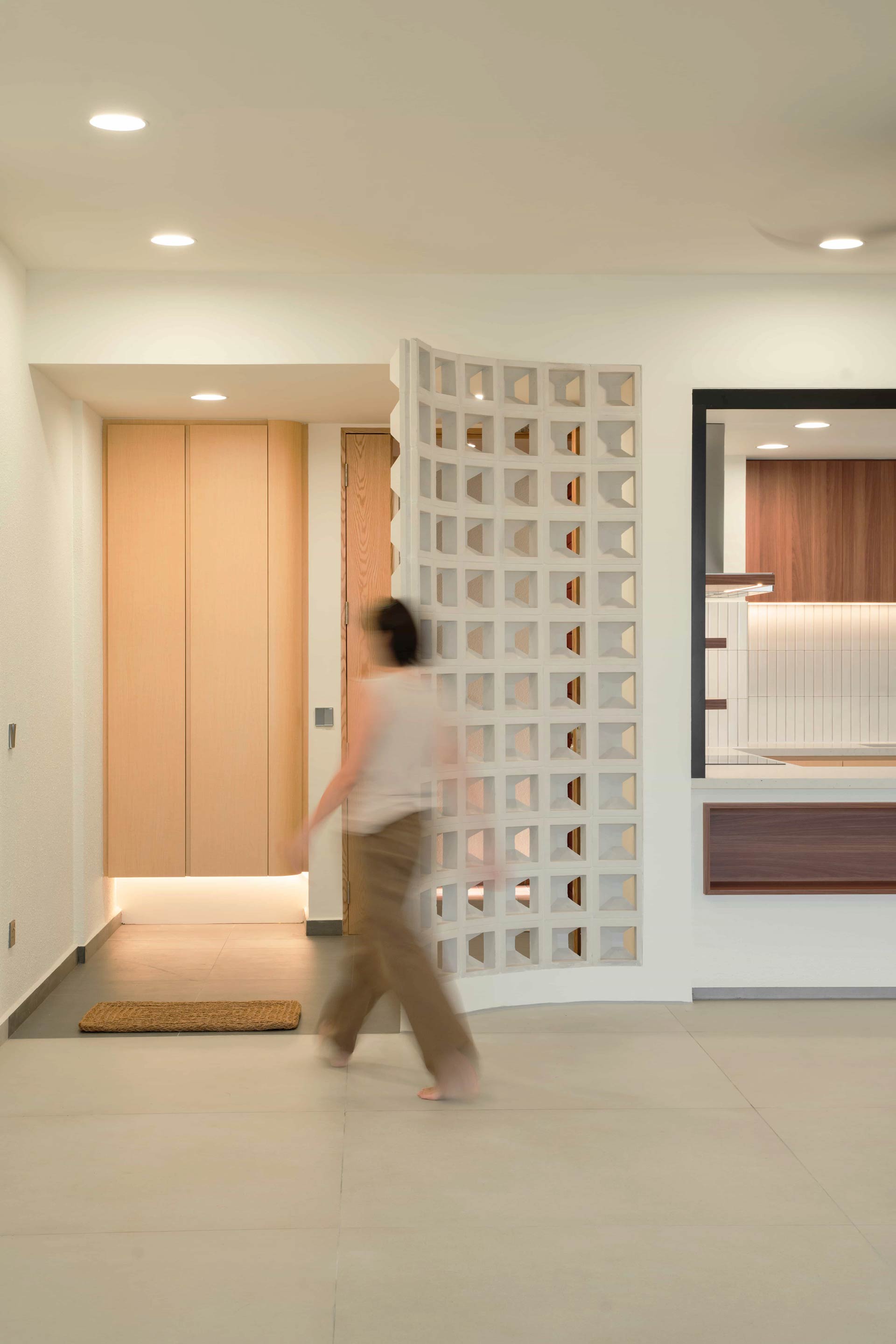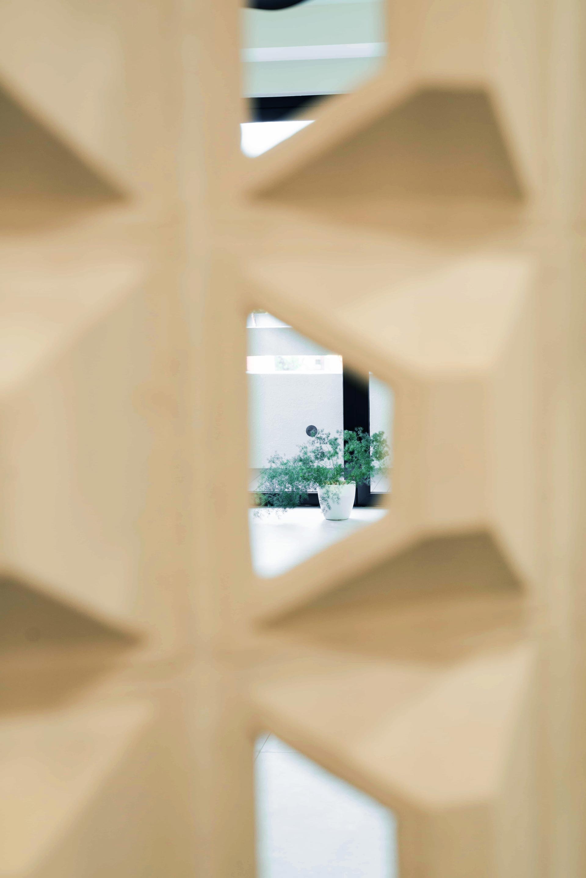 Natural materials take center stage in the design narrative, with large format tiles selected to emulate the rugged elegance of concrete flooring, enhancing the sense of spaciousness in the living areas. At the foyer, a curved full-height wall constructed with ventilation blocks ensures privacy while promoting airflow—a seamless integration of form and function.