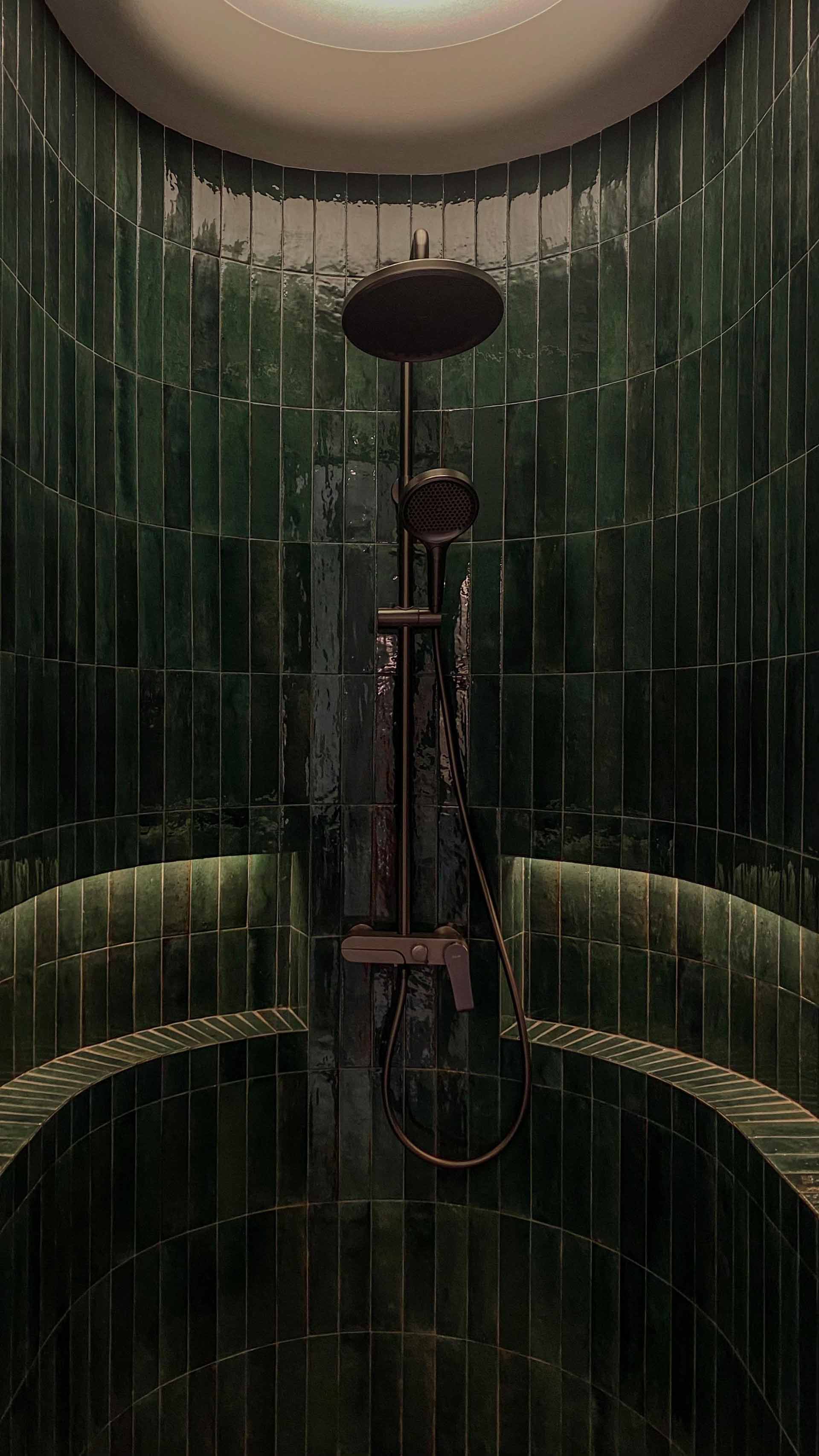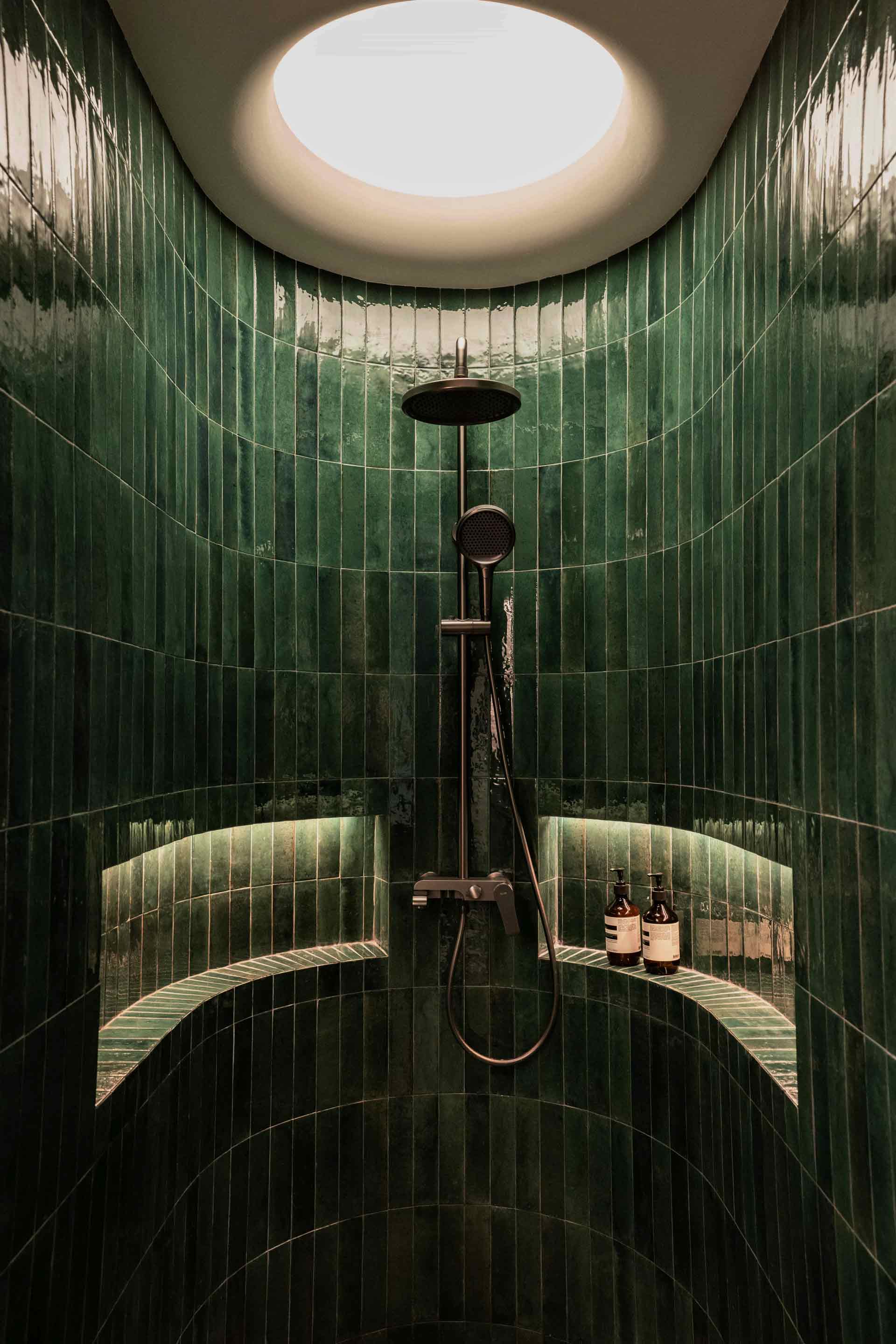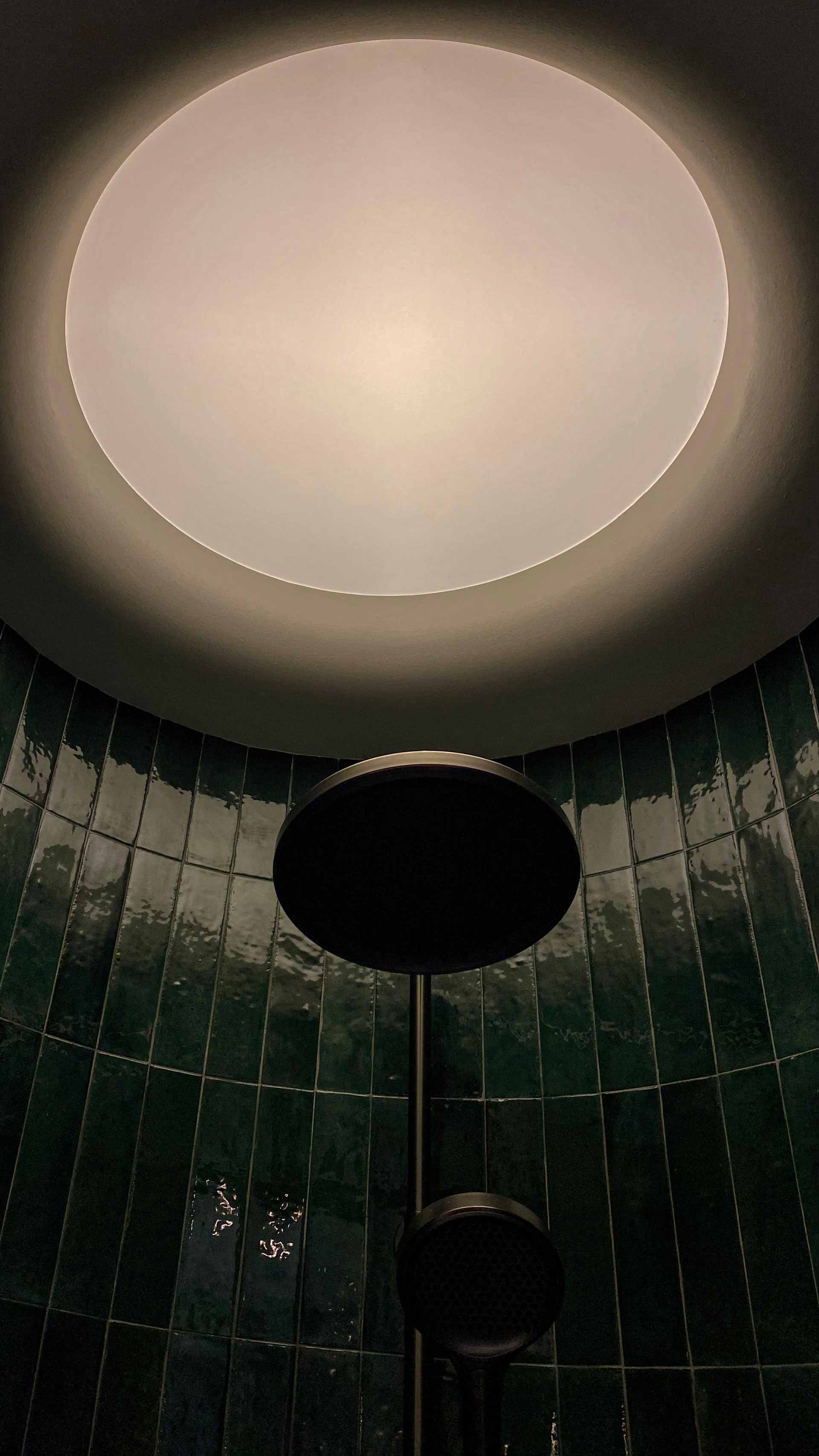 In the master bathroom, luxury seamlessly blends with practicality, with meticulously curated lighting solutions enhancing the overall ambiance. Positioned above the standing bath and nestled against the curved wall adorned in stunning emerald green subway tiles, a skylight-inspired fixture casts a soft, inviting glow. Adjacent to the bathtub area, a round luminaire designed for outdoor use illuminates the space, contributing to the creation of a tranquil spa-like retreat that exudes serenity.