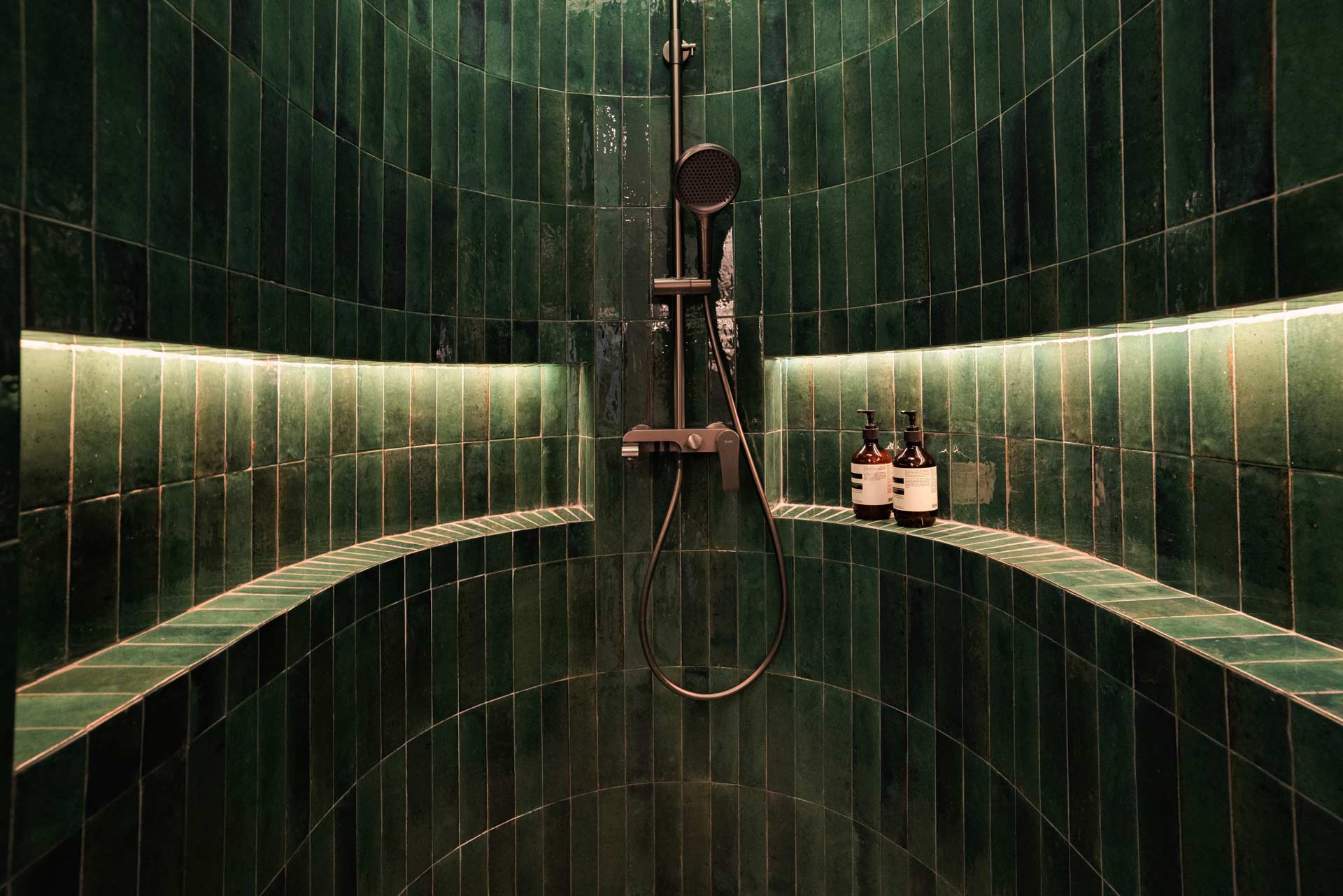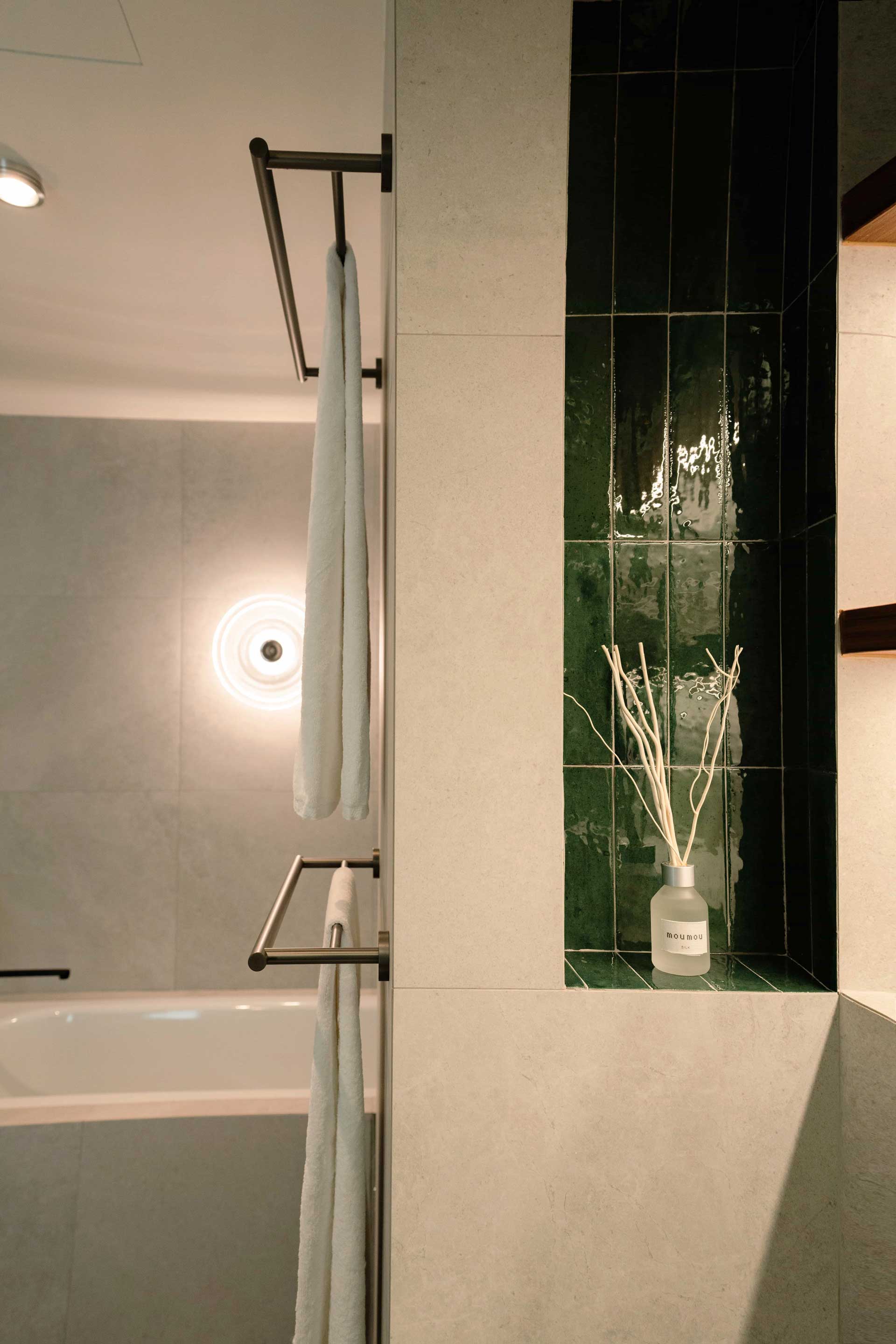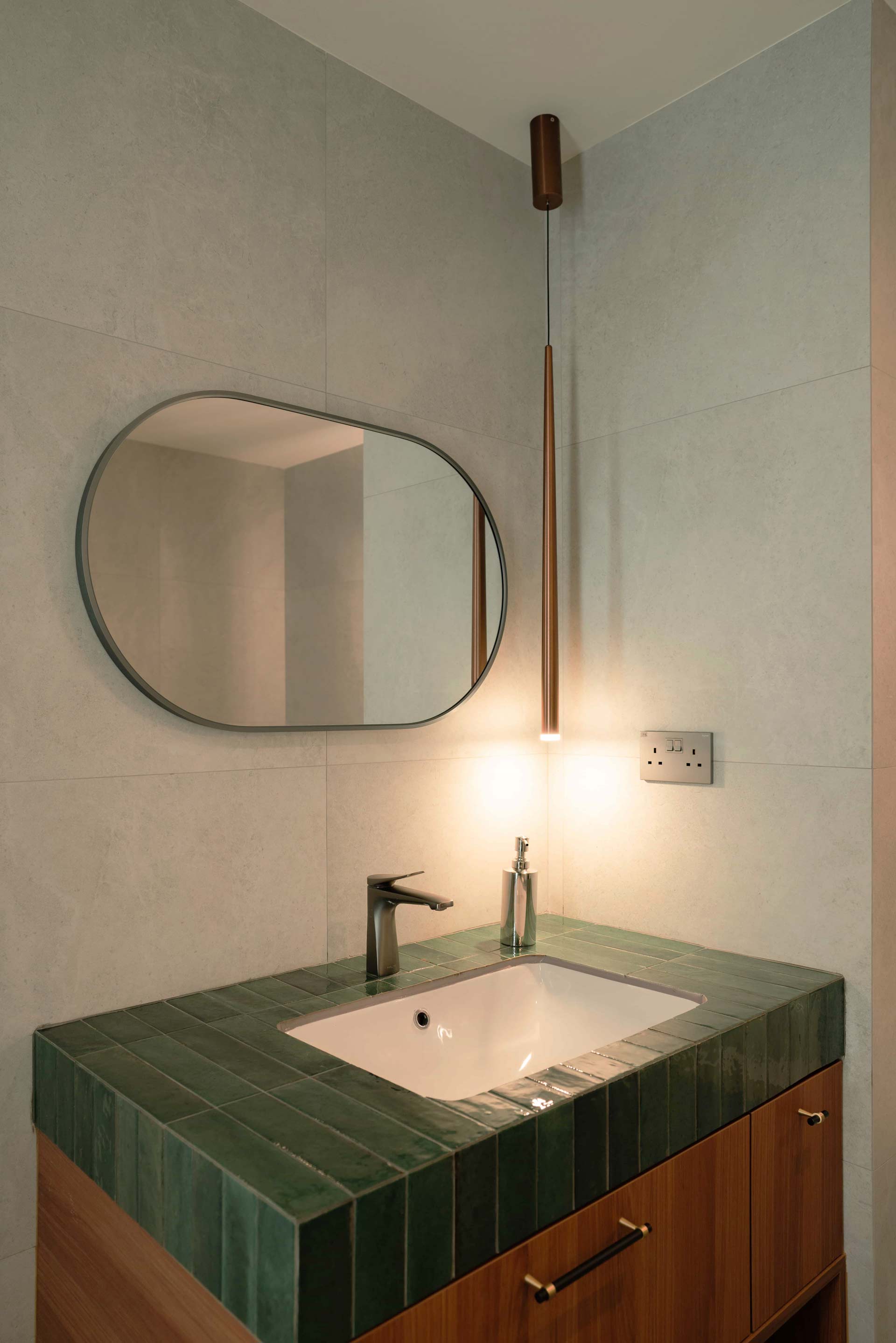 In the master bathroom, luxury seamlessly blends with practicality, with meticulously curated lighting solutions enhancing the overall ambiance. Positioned above the standing bath and nestled against the curved wall adorned in stunning emerald green subway tiles, a skylight-inspired fixture casts a soft, inviting glow. Adjacent to the bathtub area, a round luminaire designed for outdoor use illuminates the space, contributing to the creation of a tranquil spa-like retreat that exudes serenity.