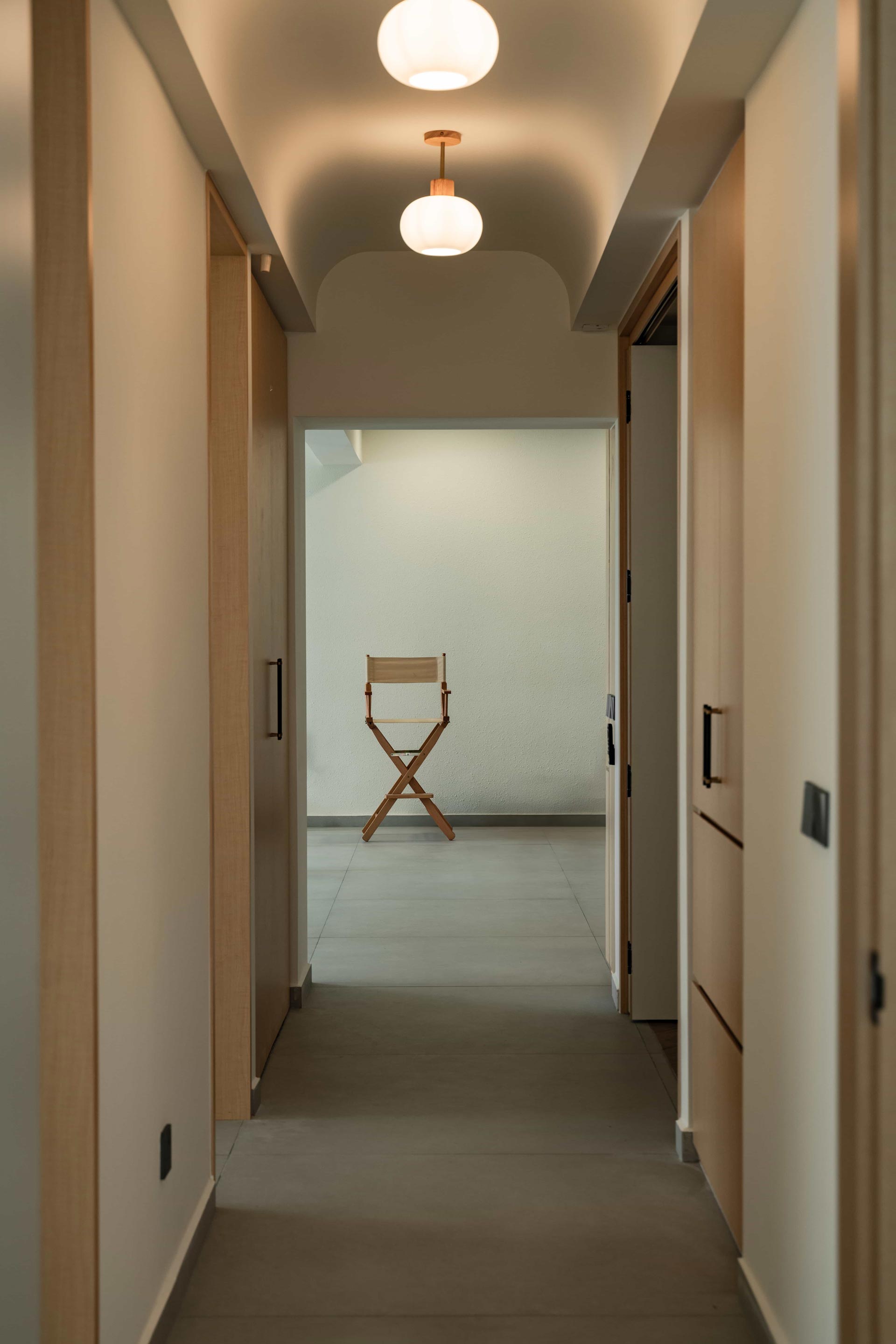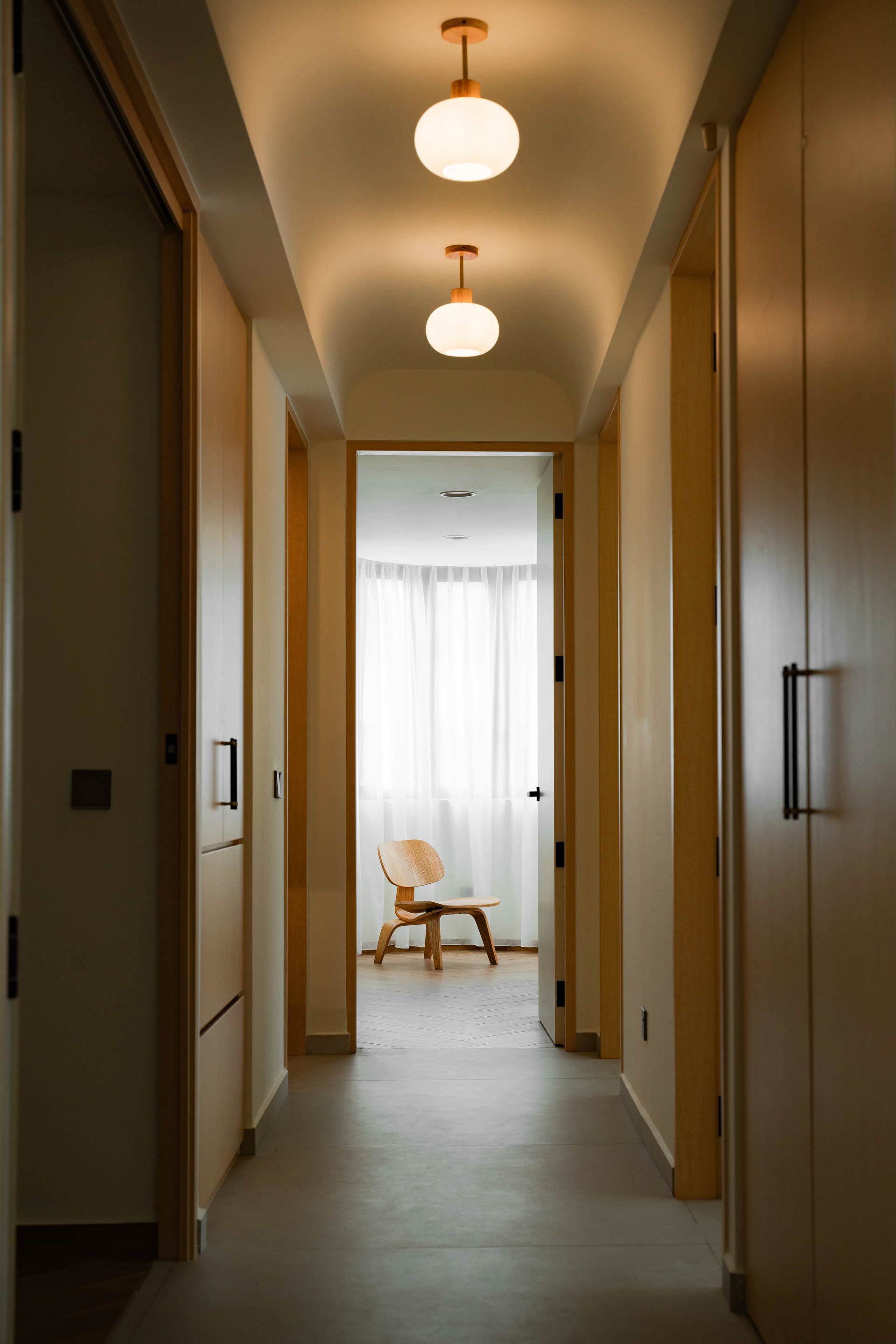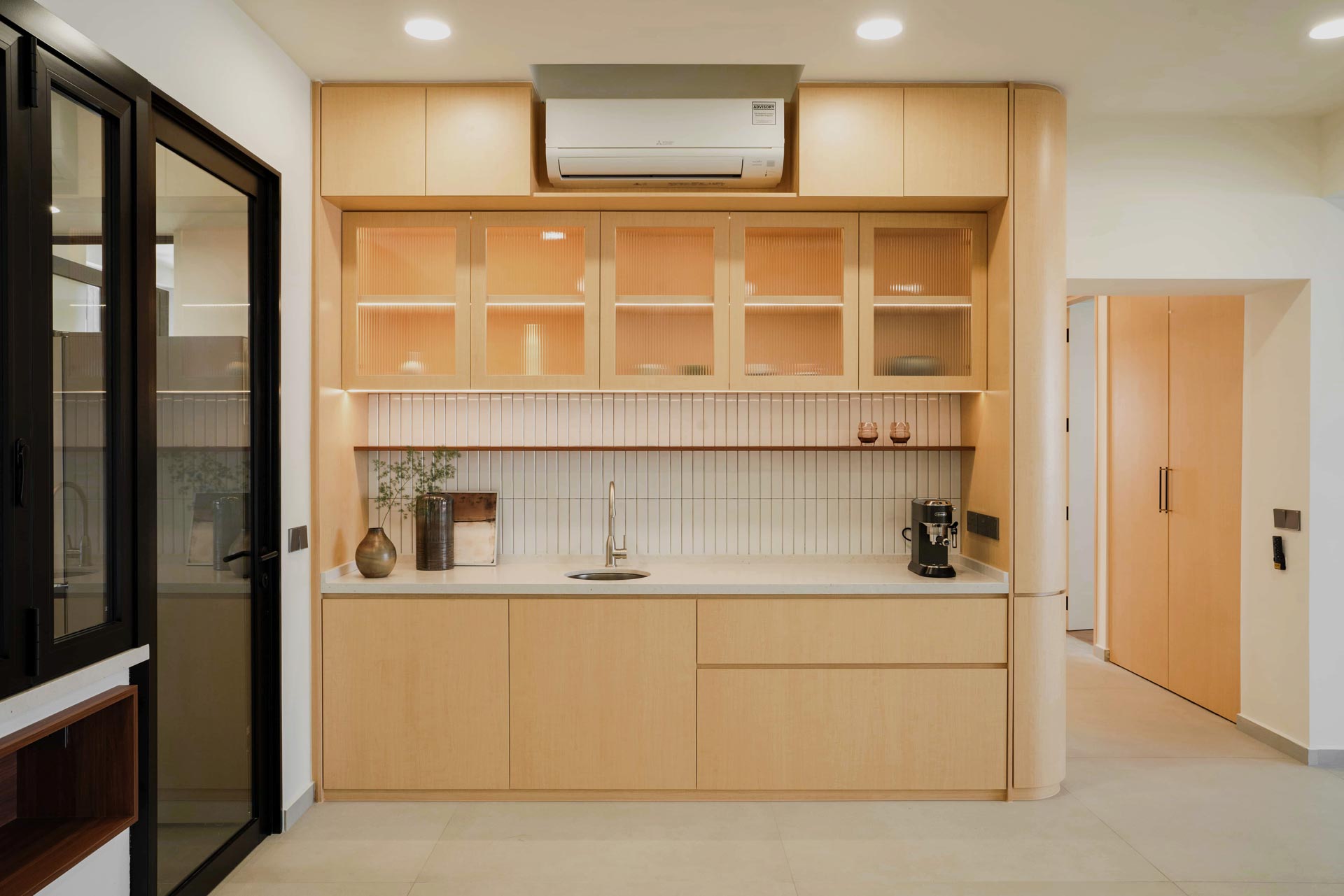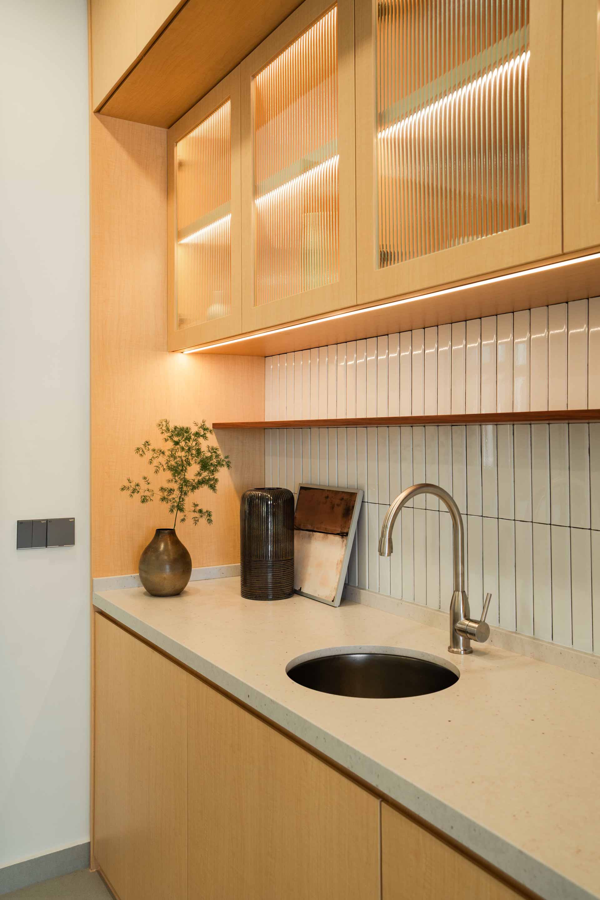 The interior design is guided by adaptability and efficient space utilization, tailored to meet the client's requirements. By creatively combining former storage cabinet and a small maid’s room, a versatile study cum guest room is crafted. Additionally, strategically positioned deep cabinets along the corridor leading to the bedrooms optimize storage without compromising the unified aesthetic.
