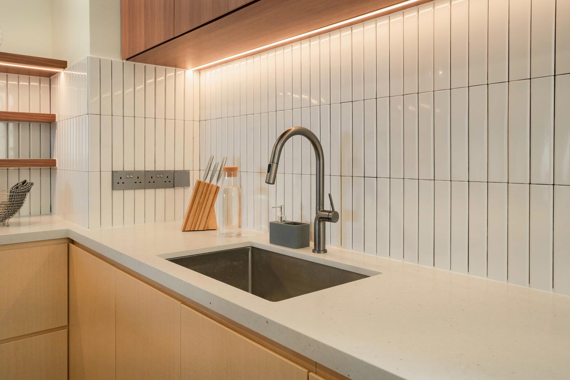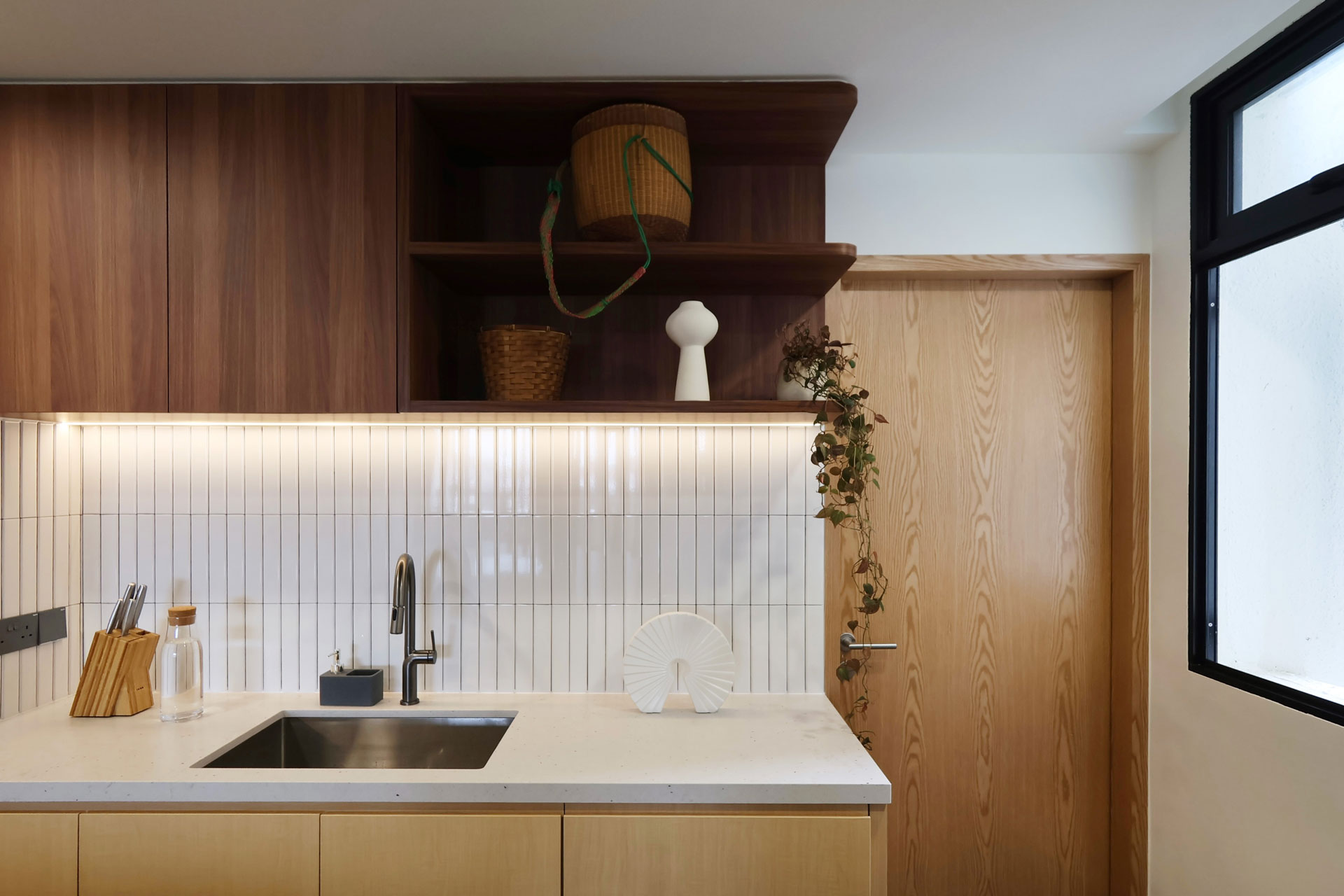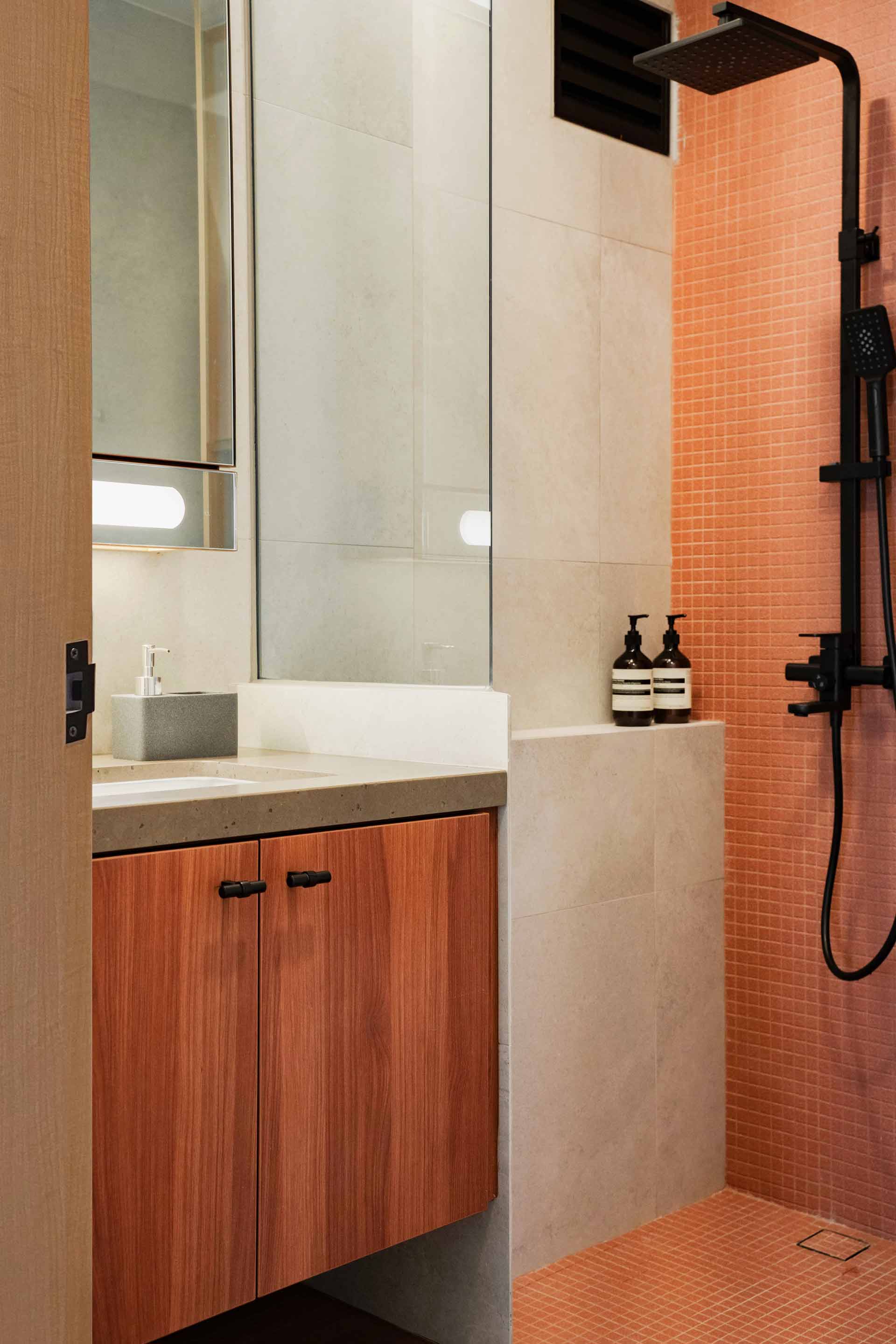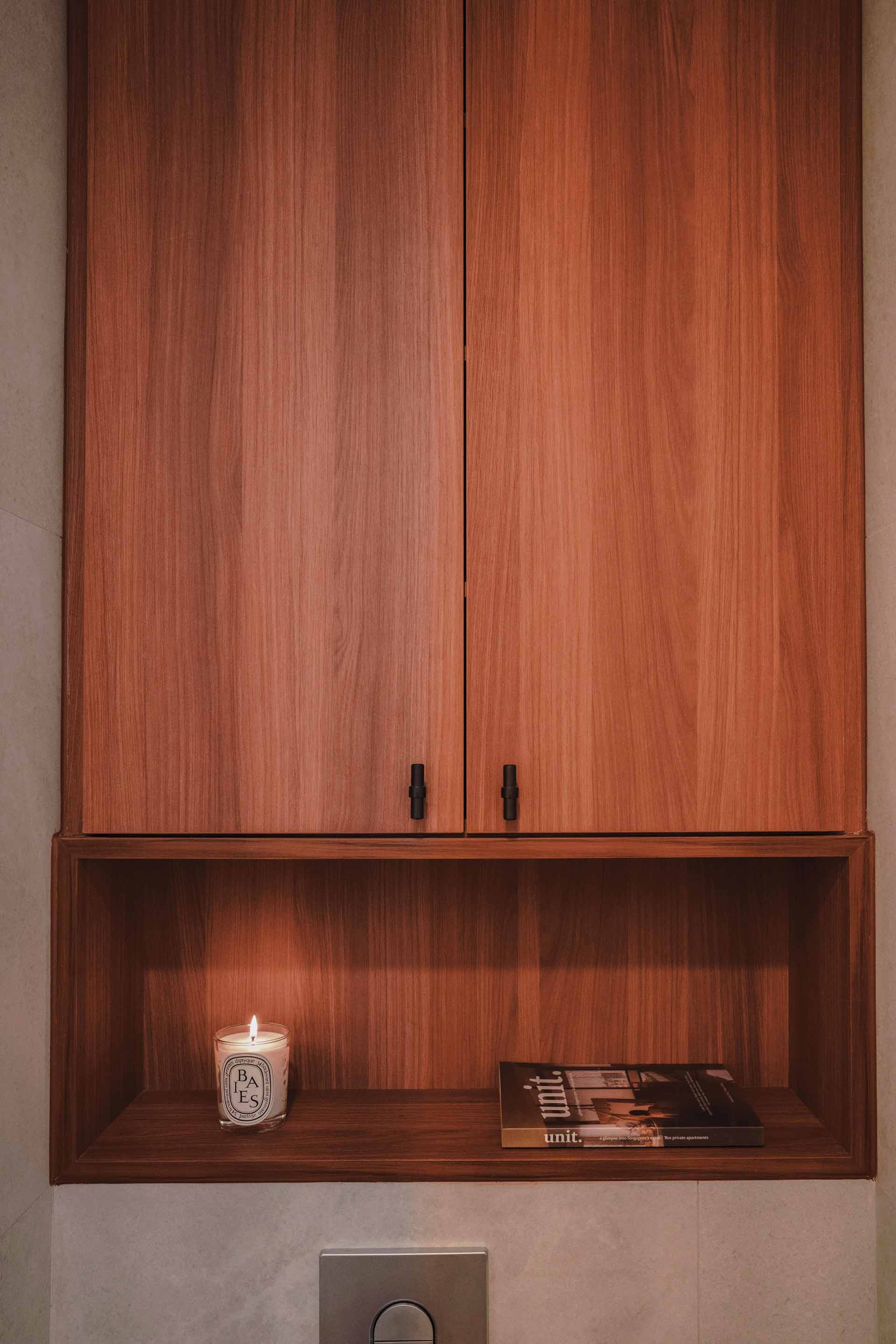 Warmth and character are infused throughout the space via two complementing wood accents, gracing bespoke carpentry and custom fire-rated doors at both the main and rear entrances. This infusion of natural elements elevates the ambiance, creating a welcoming atmosphere that resonates throughout the apartment.