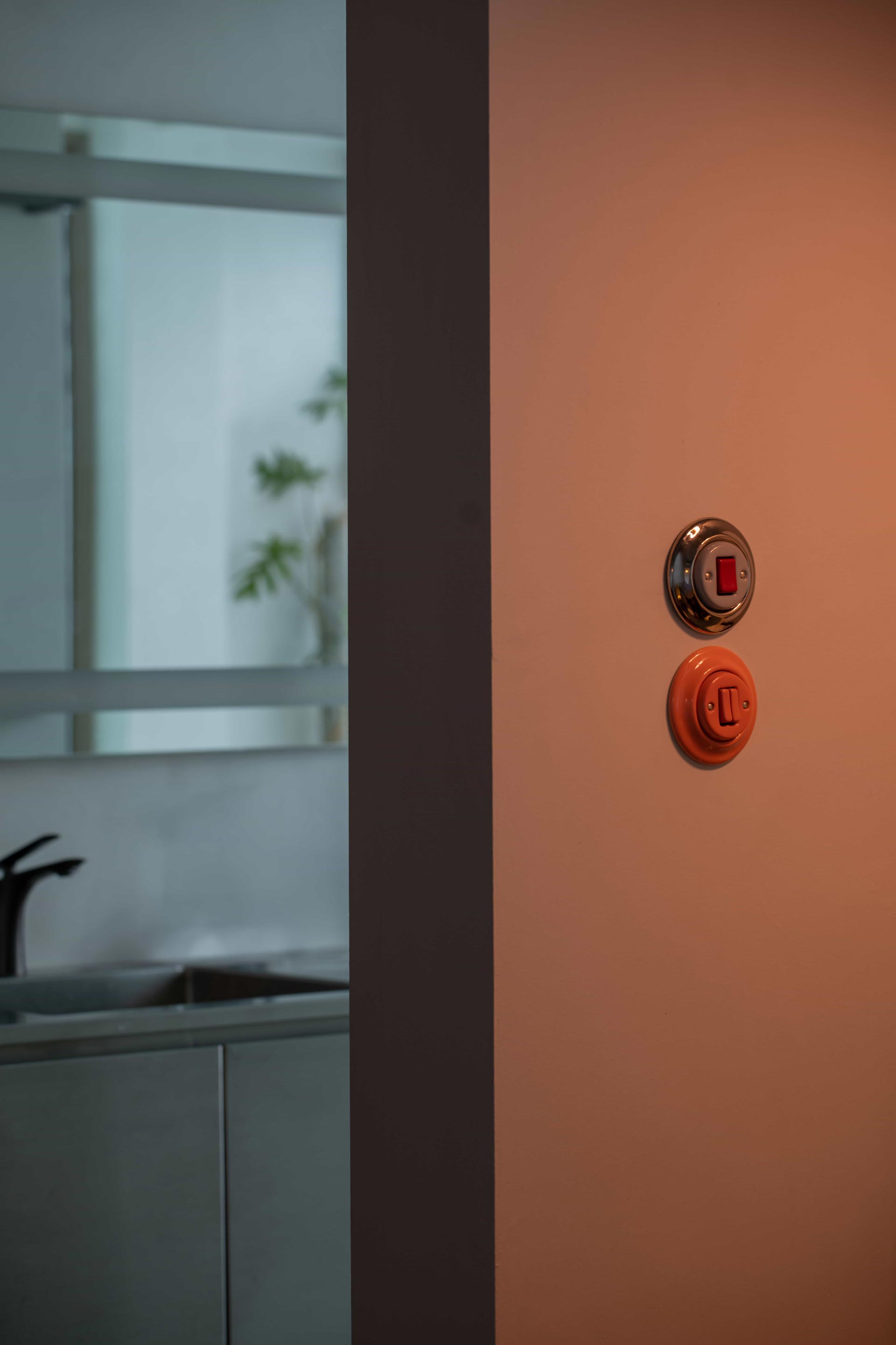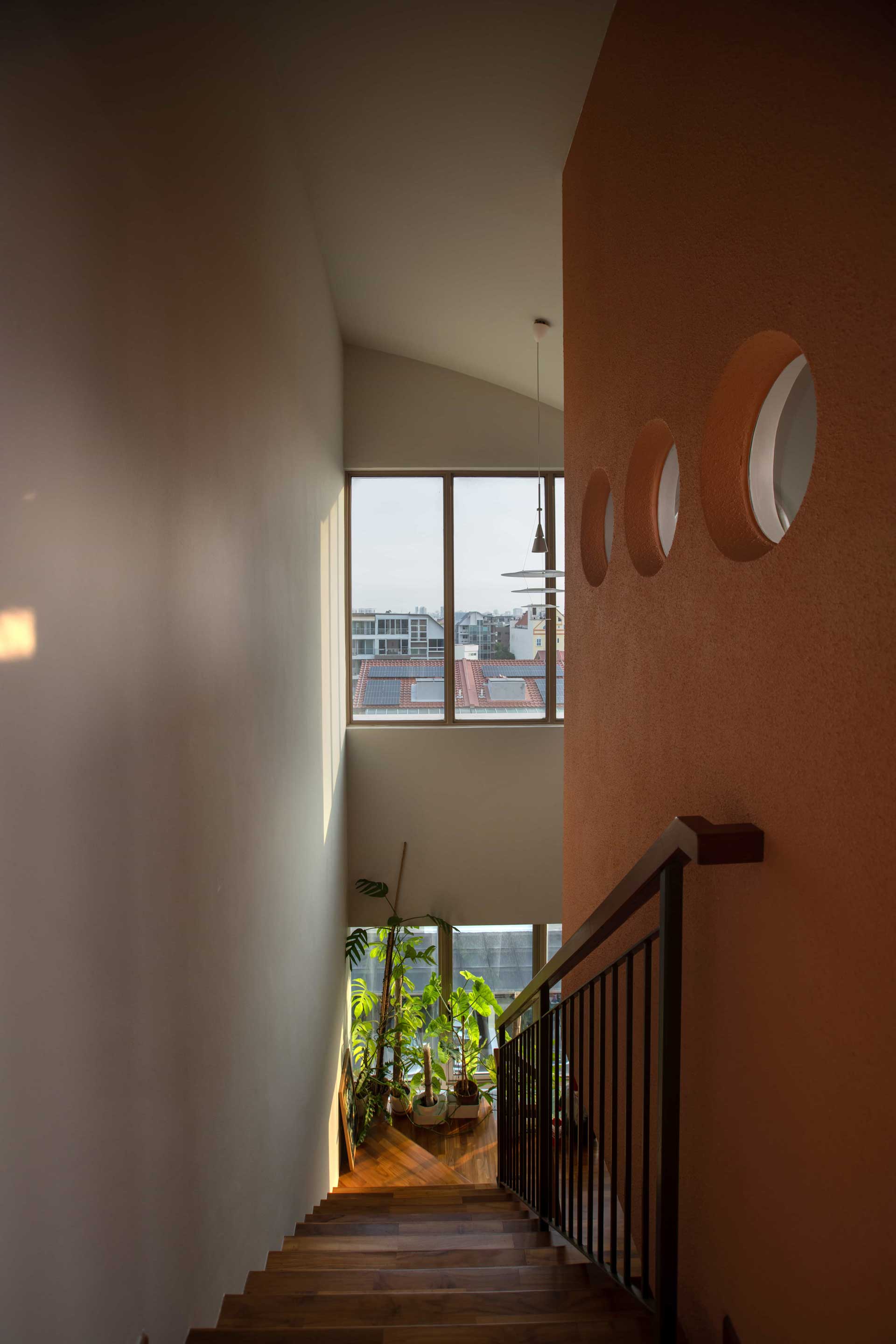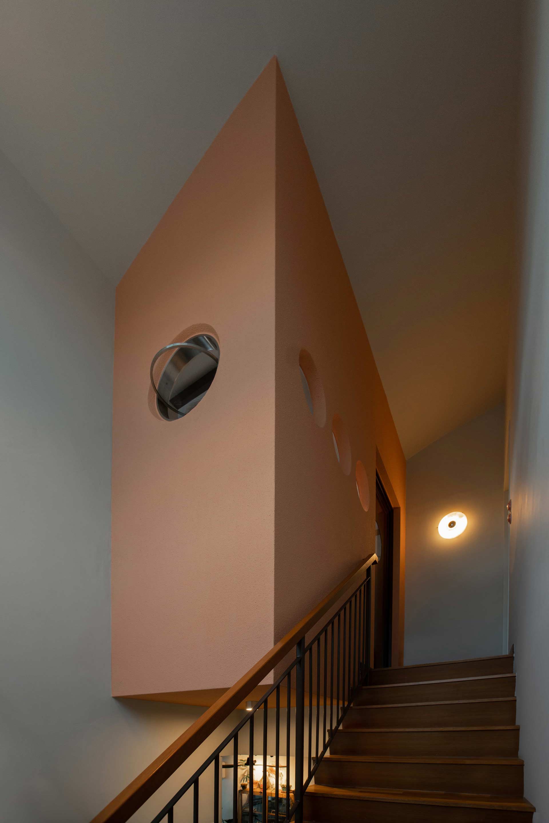 Ascending the staircase reveals a captivating sight: a striking cantilevered pod painted in a bold salmon pink hue, adorned with circular openings. At the upper landing, an exquisite alabaster stone feature wall lamp guides the way to the roof terrace and master bedroom entrances.
