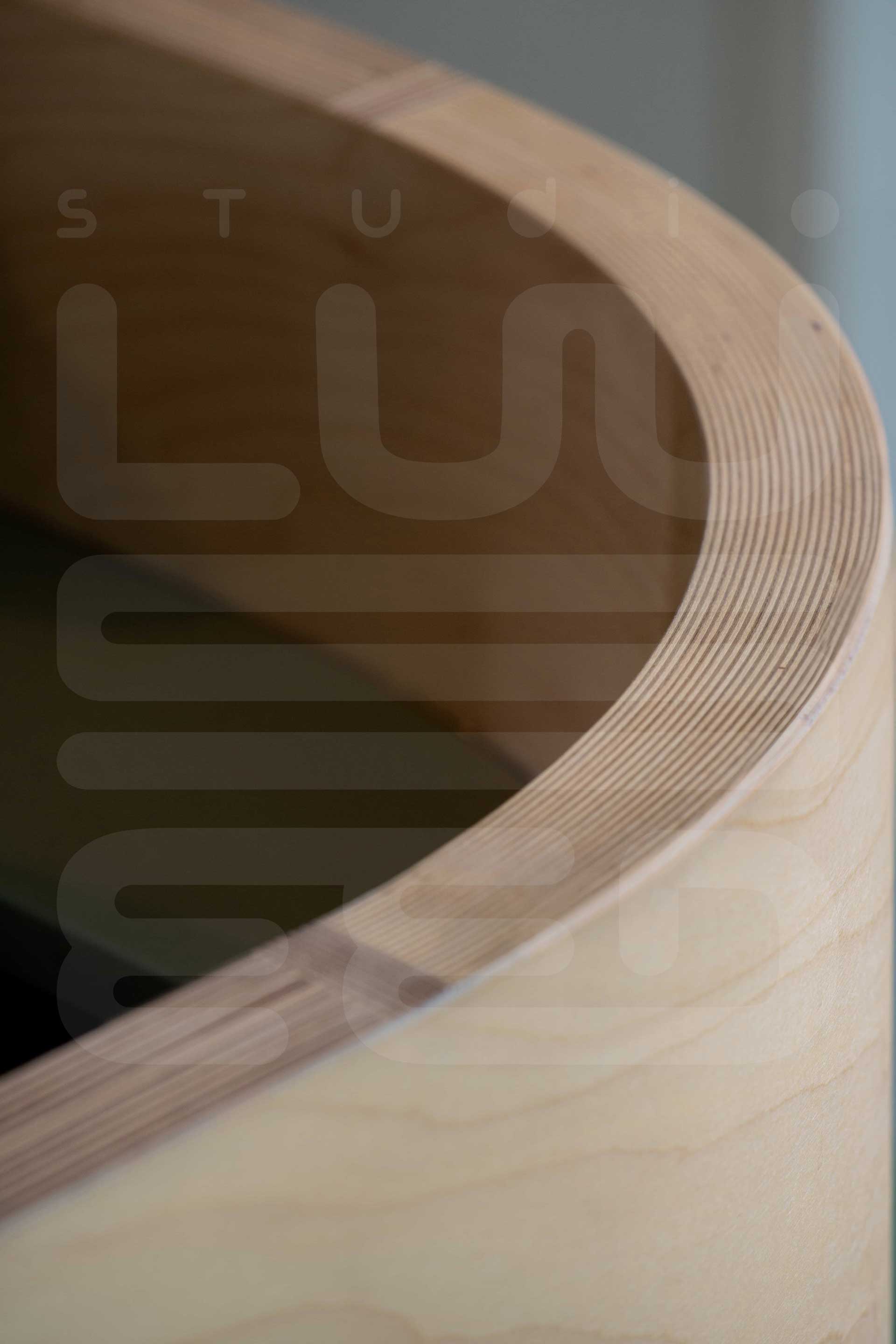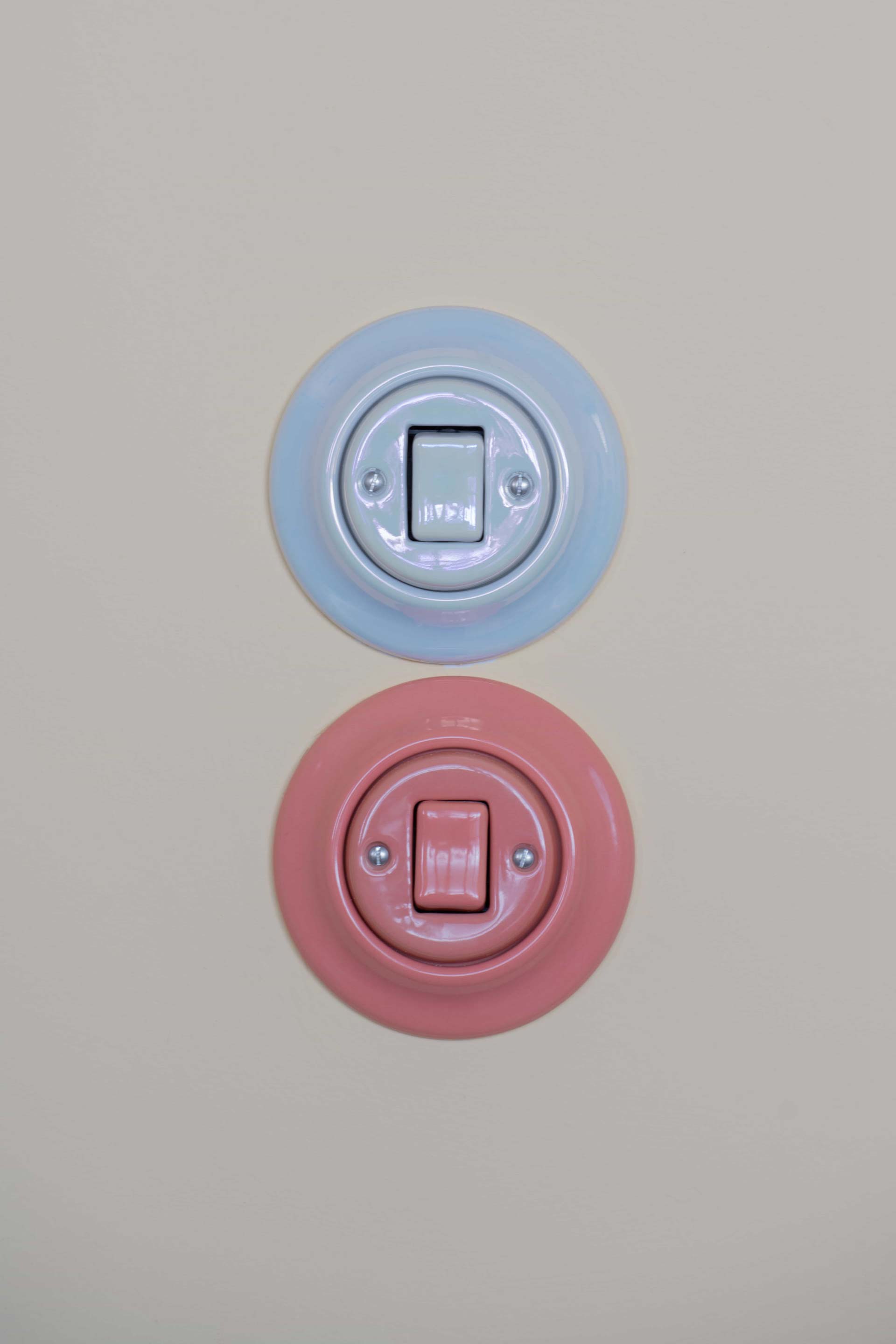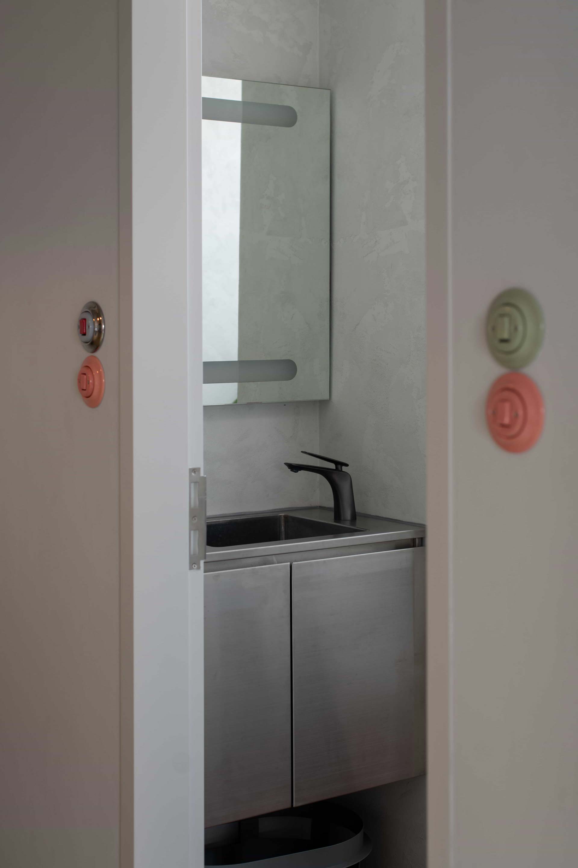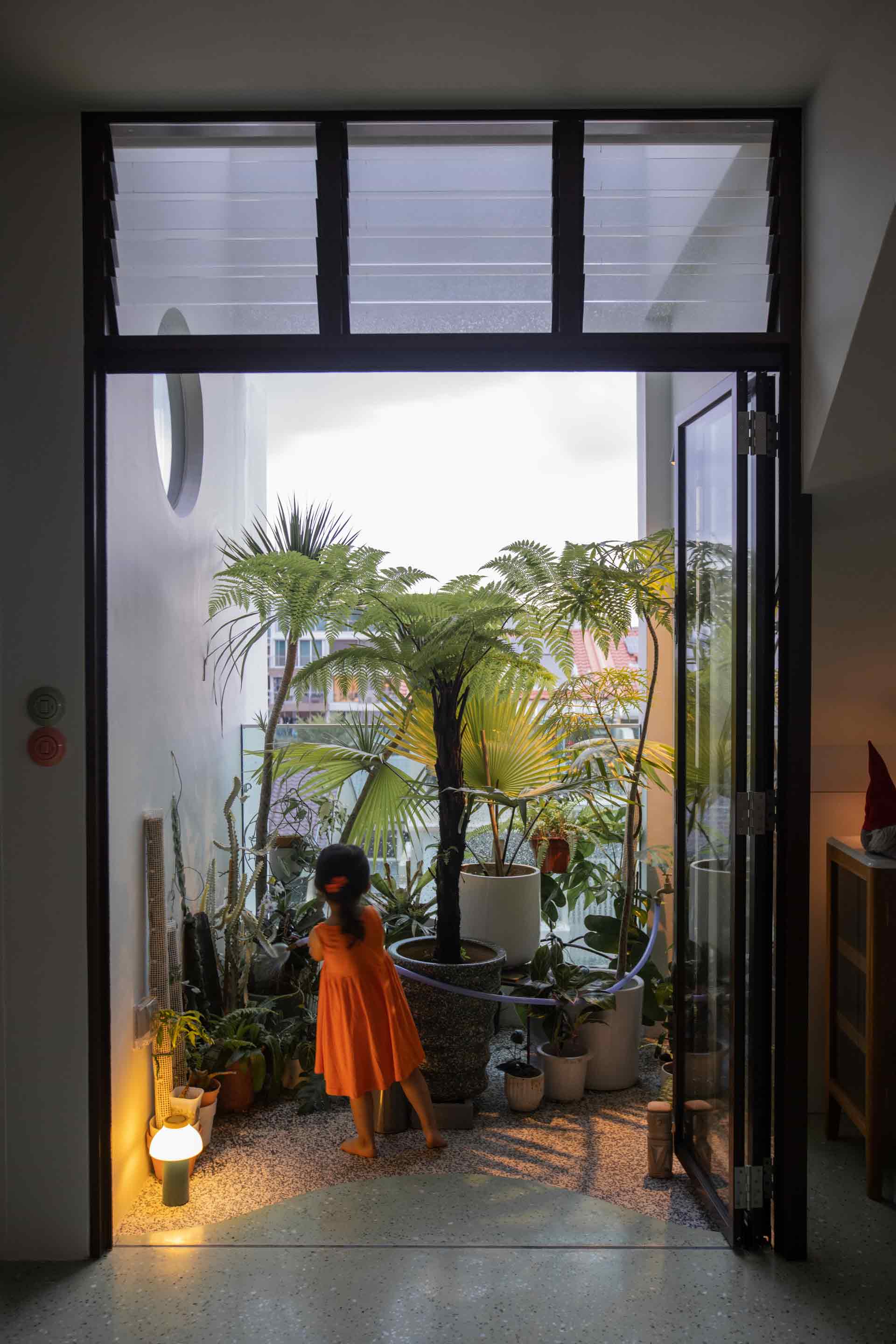 Ascending the staircase reveals a captivating sight: a striking cantilevered pod painted in a bold salmon pink hue, adorned with circular openings. At the upper landing, an exquisite alabaster stone feature wall lamp guides the way to the roof terrace and master bedroom entrances.