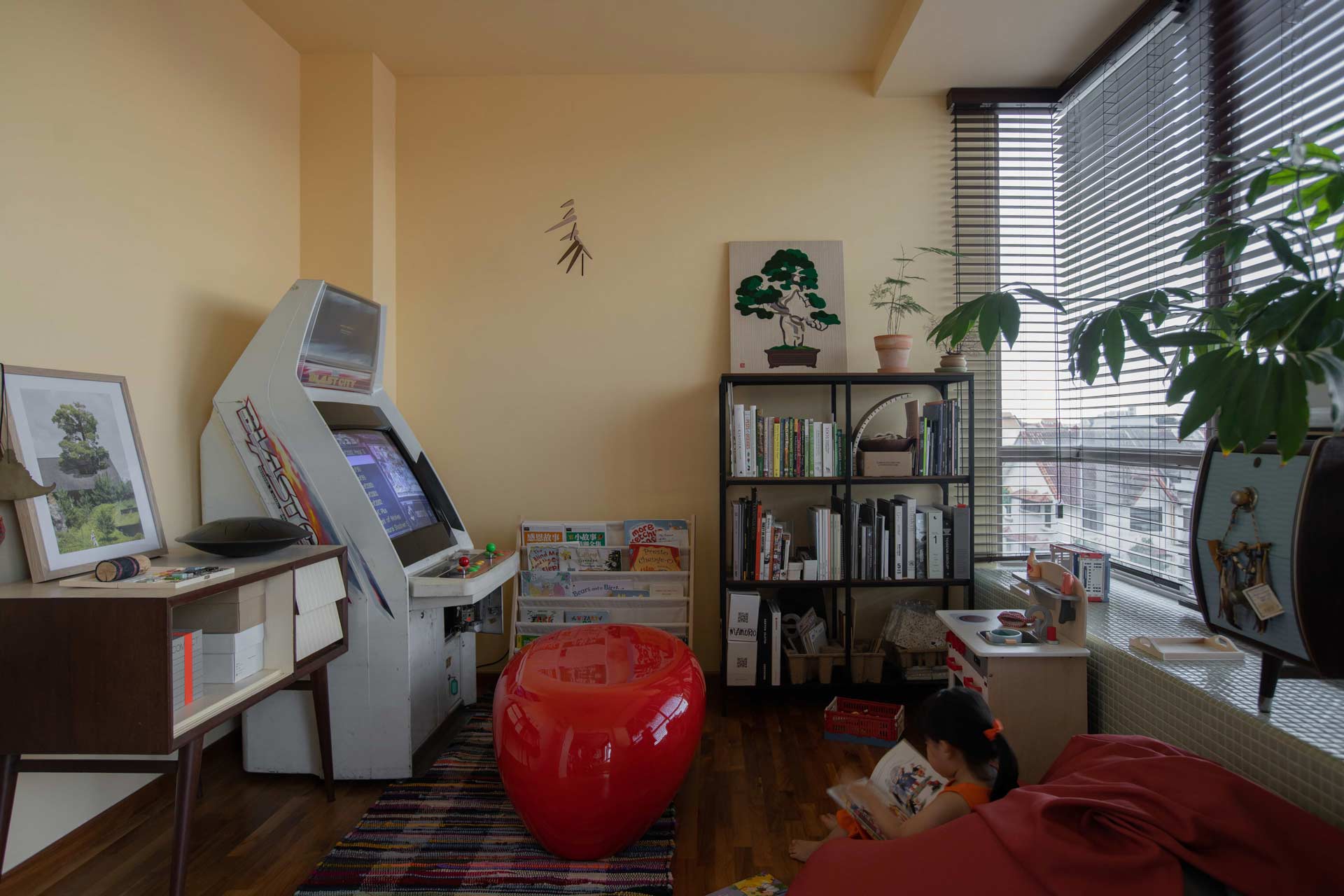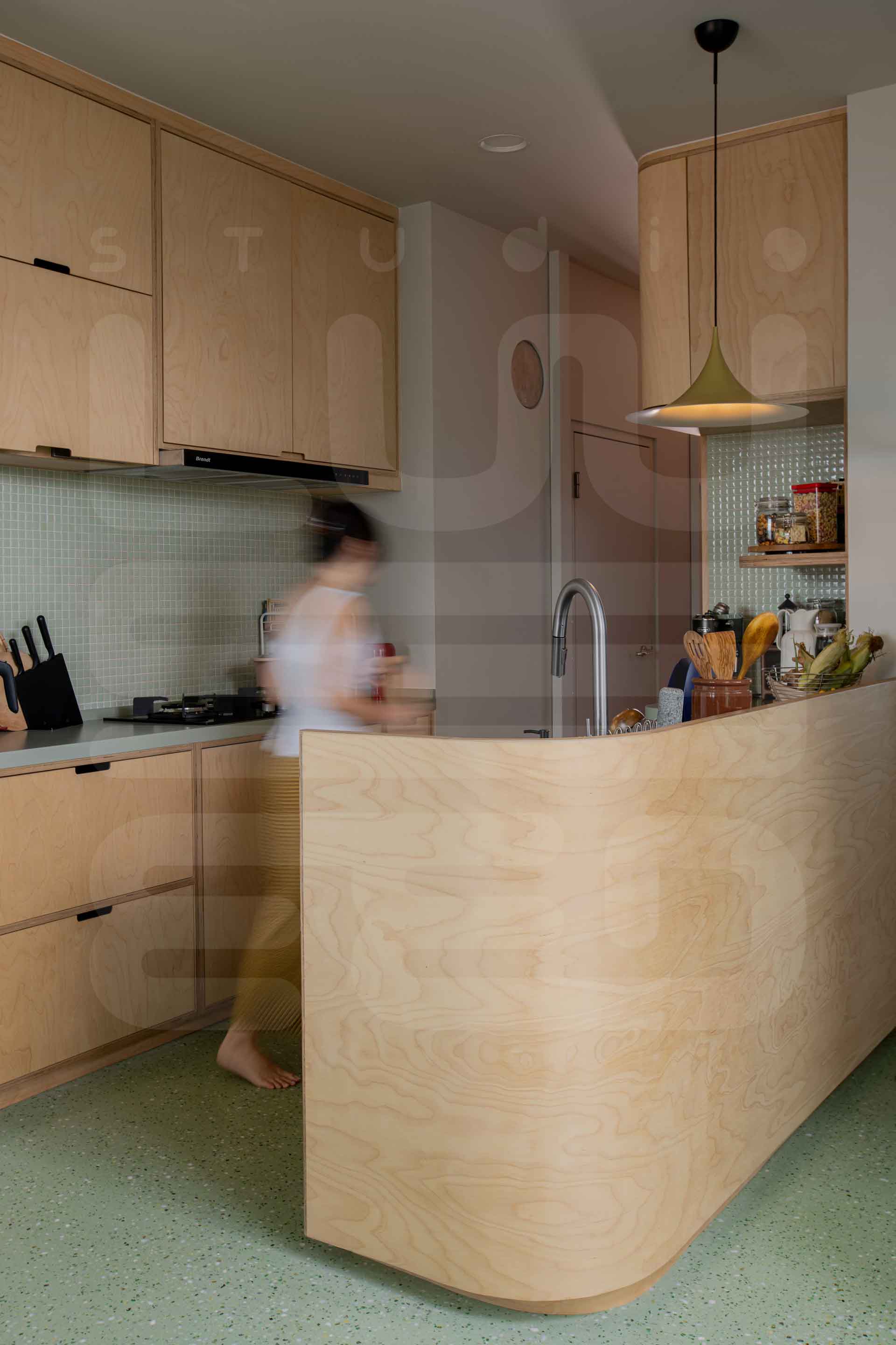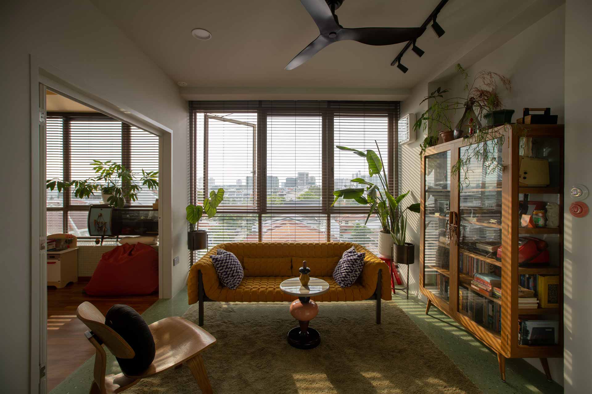 A defining feature of the penthouse is the Sky Pod, ingeniously designed to bring a touch of nature into the heart of the home. Enhanced by a preference for natural materials such as birch plywood cabinetry, which harmonizes seamlessly with the owners' treasured teakwood furniture collection and carefully curated light fixtures, the space achieves a distinctive and eclectic aesthetic.