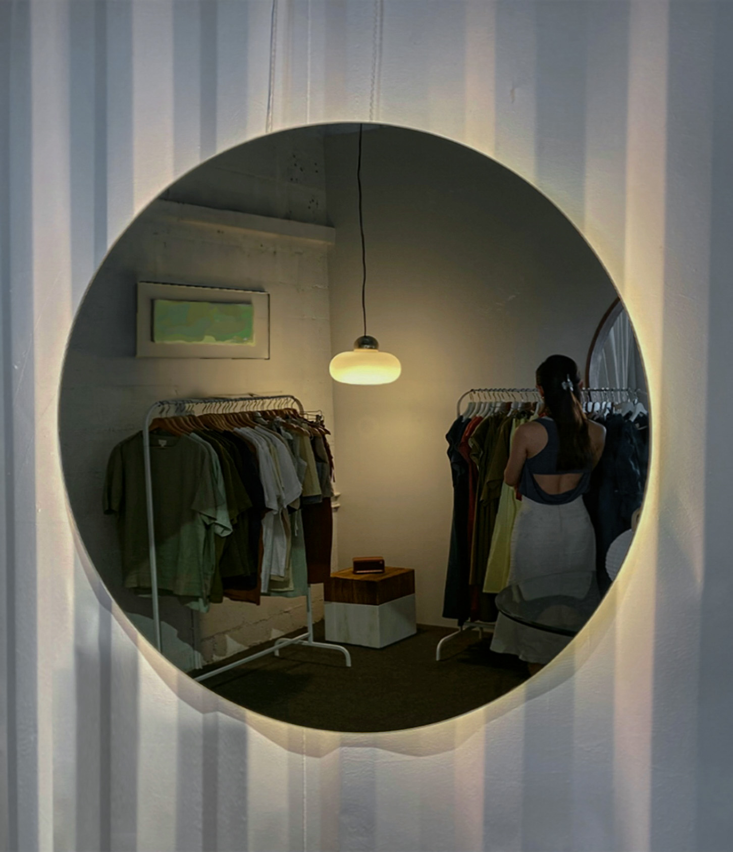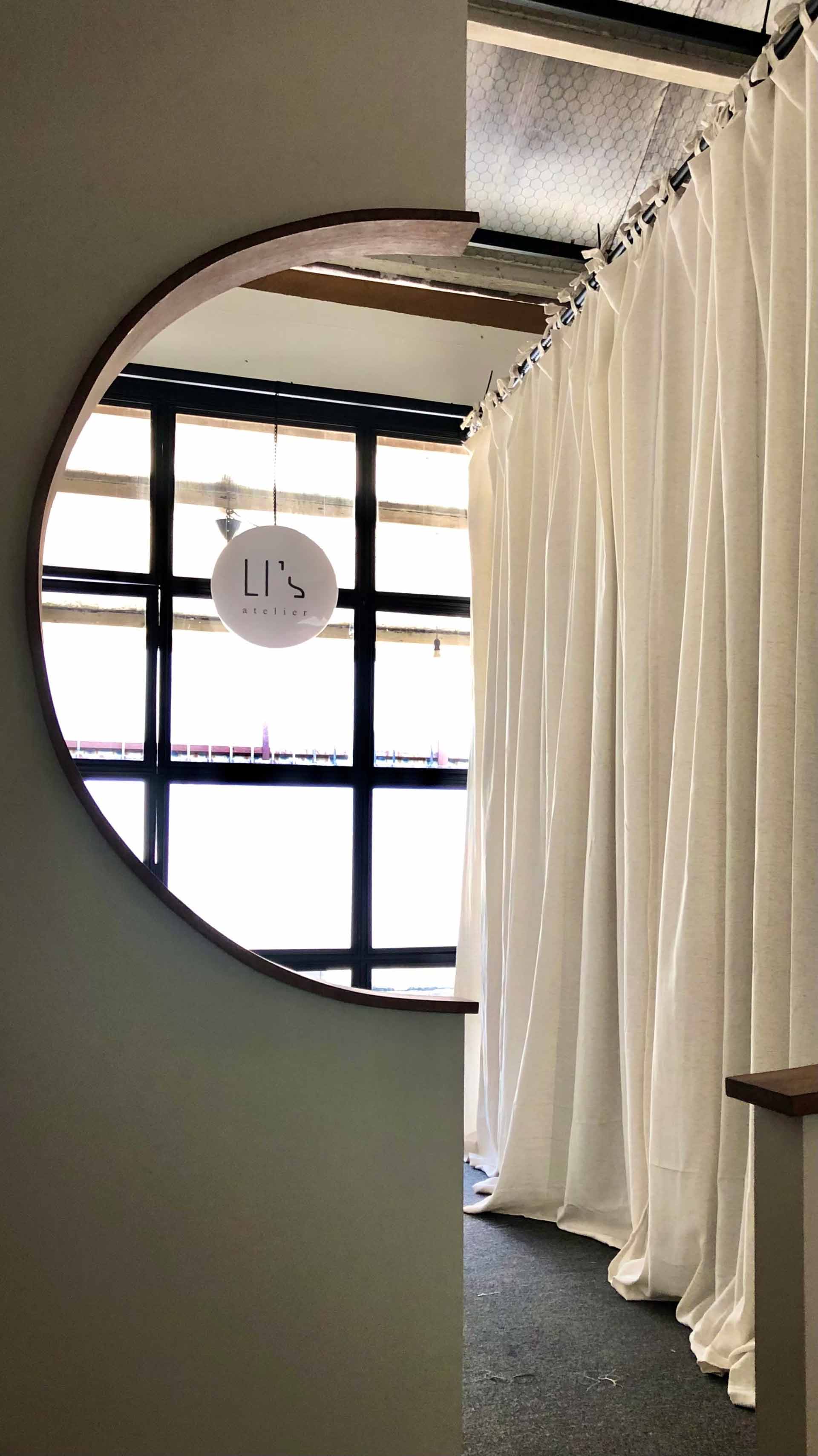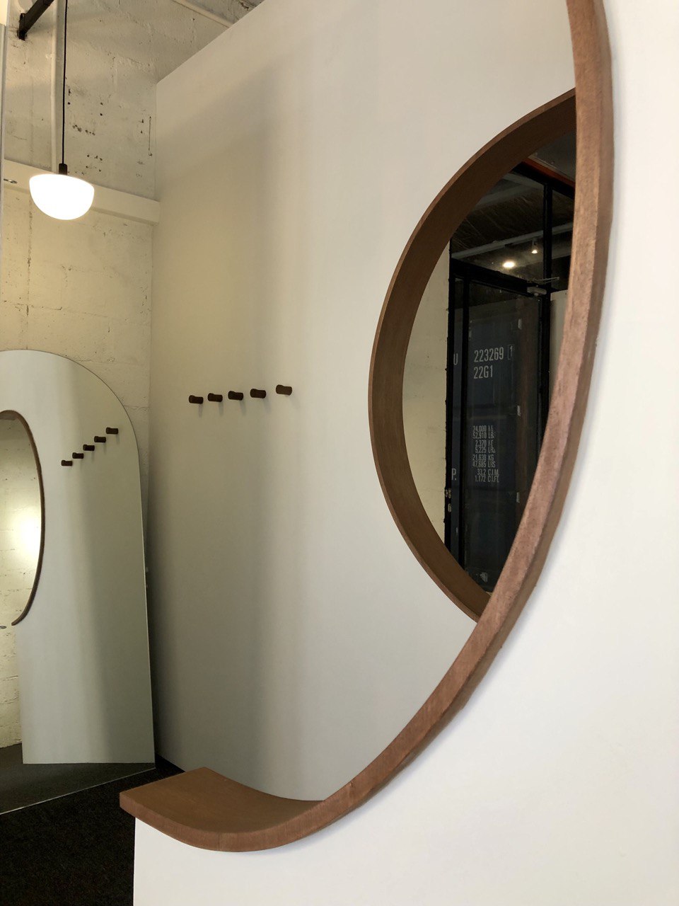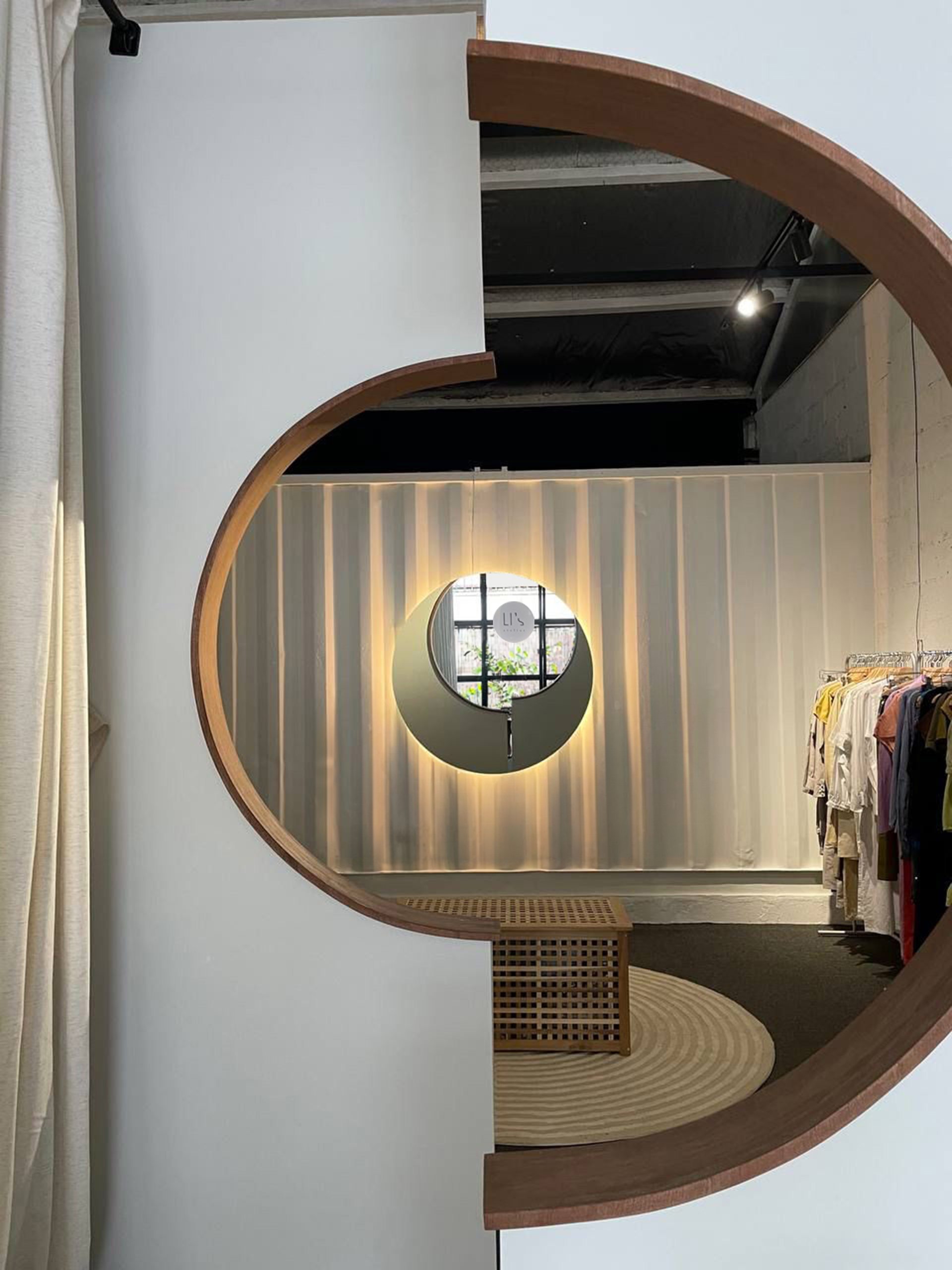 The brand signage and mirror is framed by the two halved arches and placed in the opposite direction, allowing to function as a spatial divider between the retail space, the changing room and the client’s work studio.