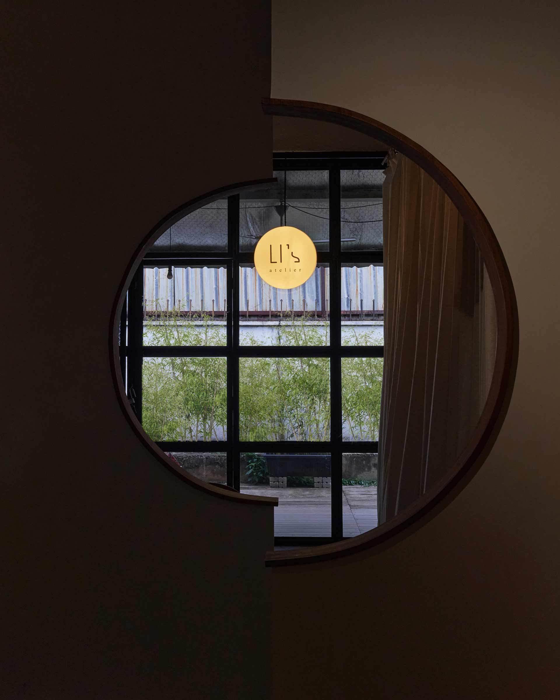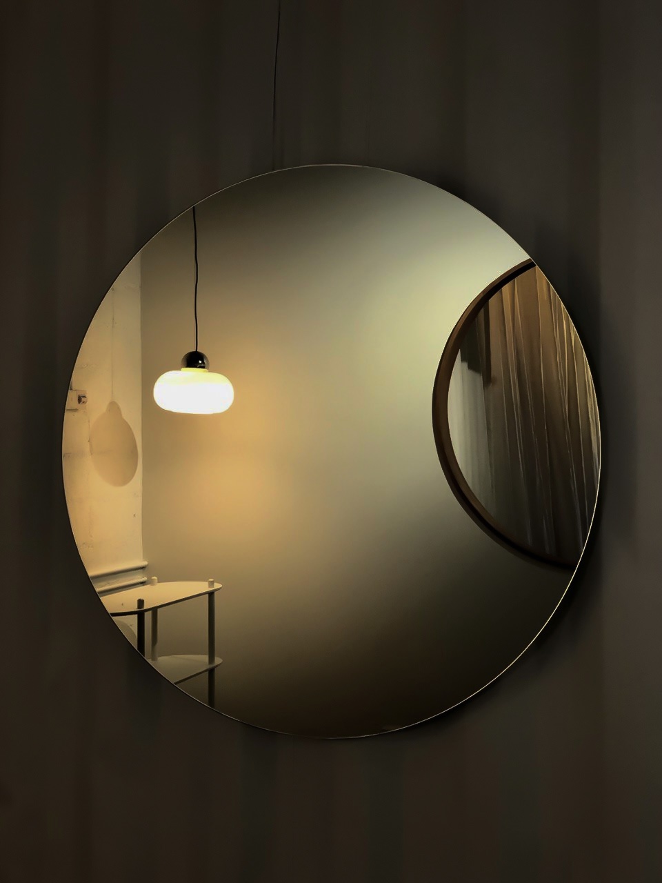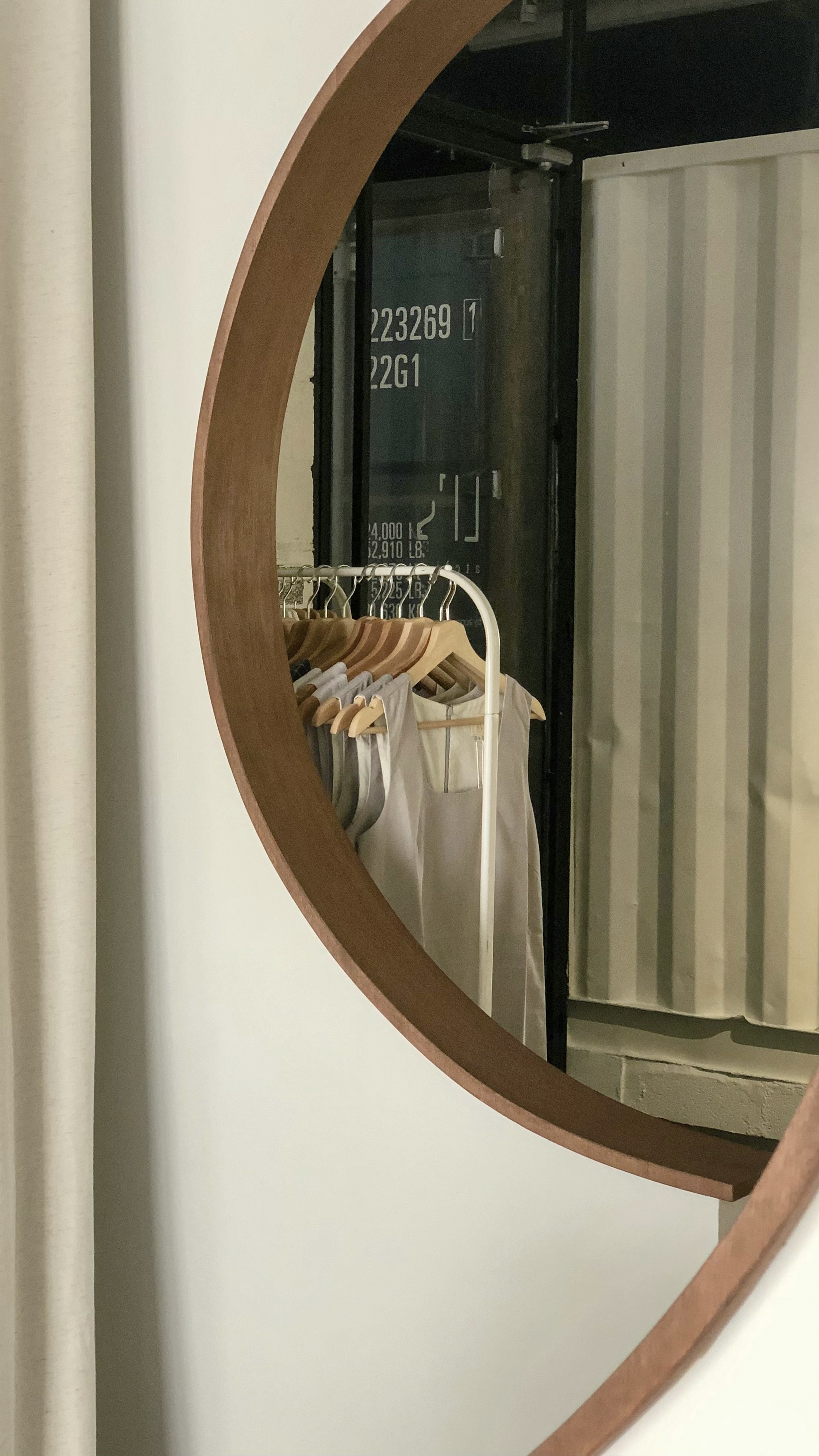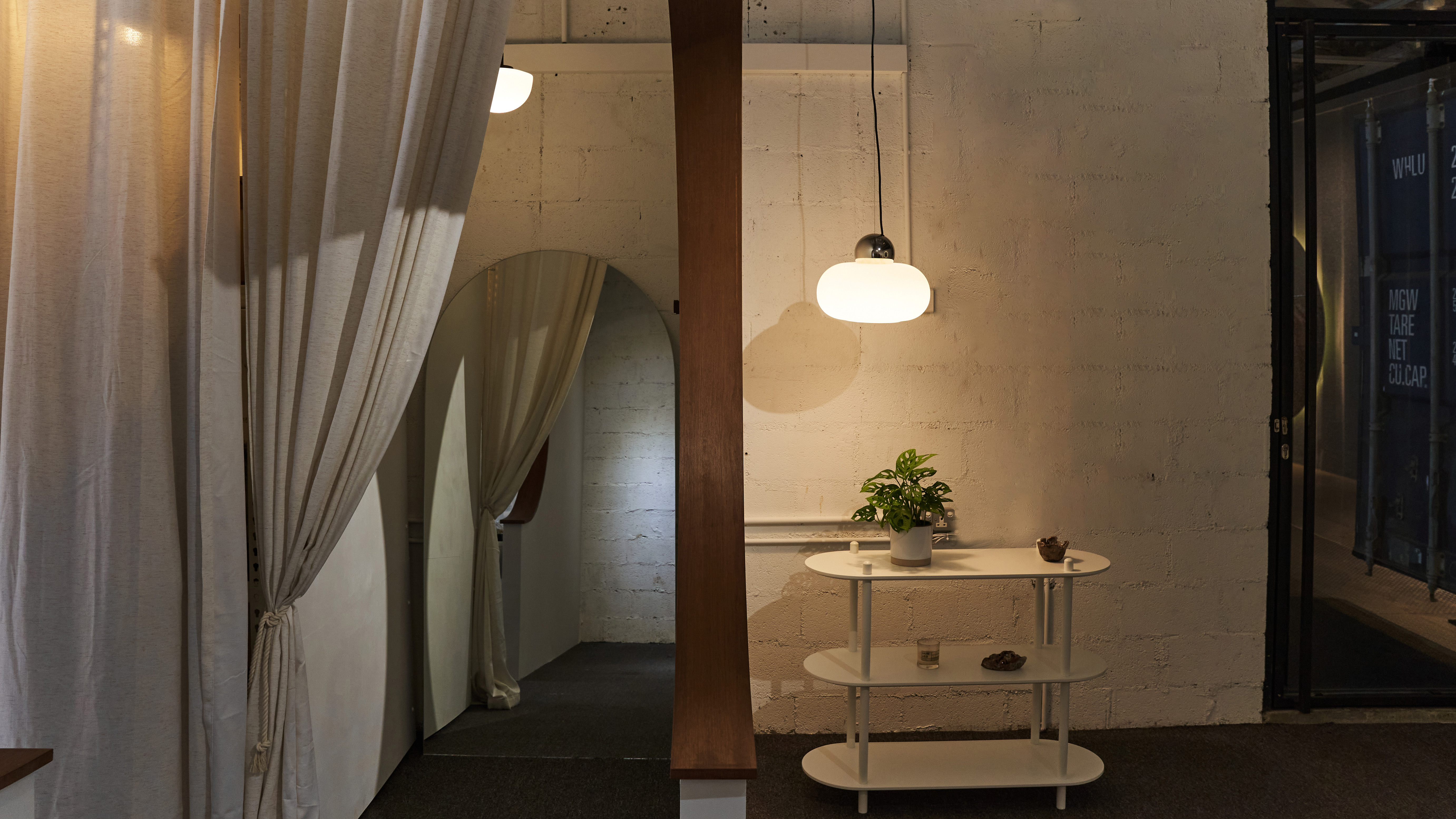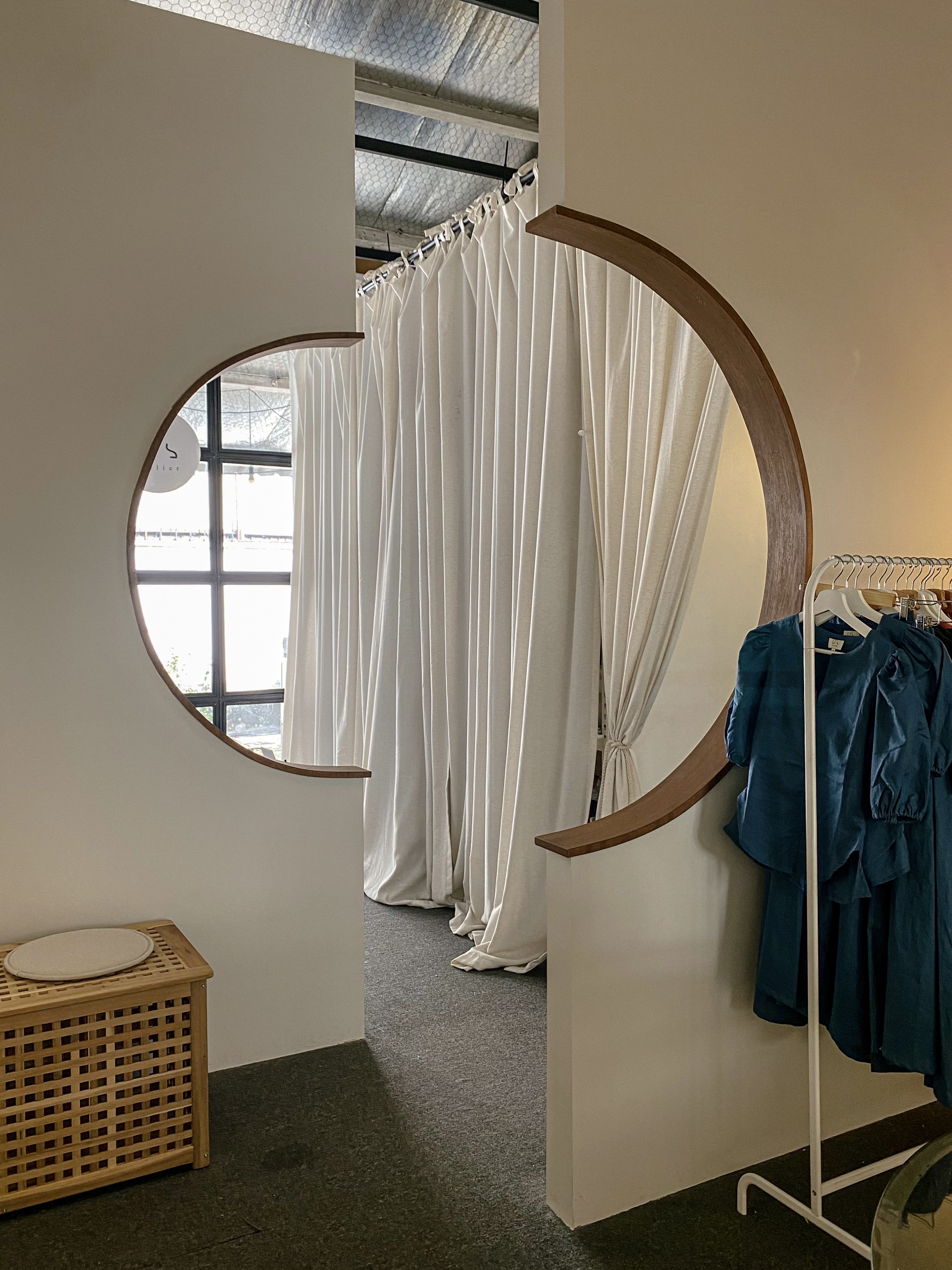 The brand signage and mirror is framed by the two halved arches and placed in the opposite direction, allowing to function as a spatial divider between the retail space, the changing room and the client’s work studio.